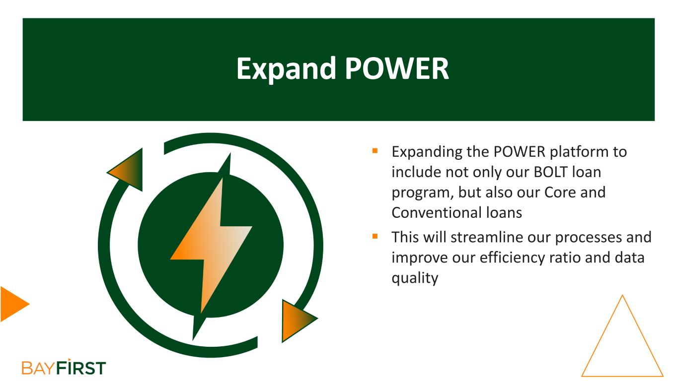 Expand POWER  Expanding the POWER platform to include not only our BOLT loan program, but also our Core and Conventional loans  This will streamline our processes and improve our efficiency ratio and data quality