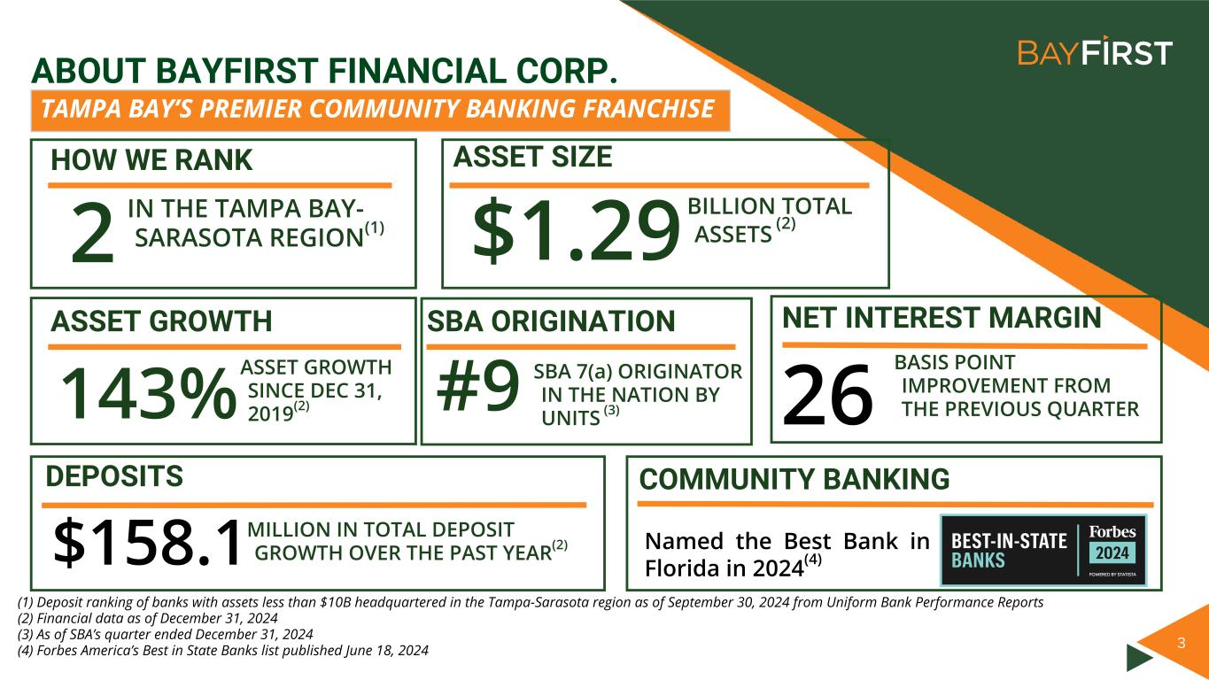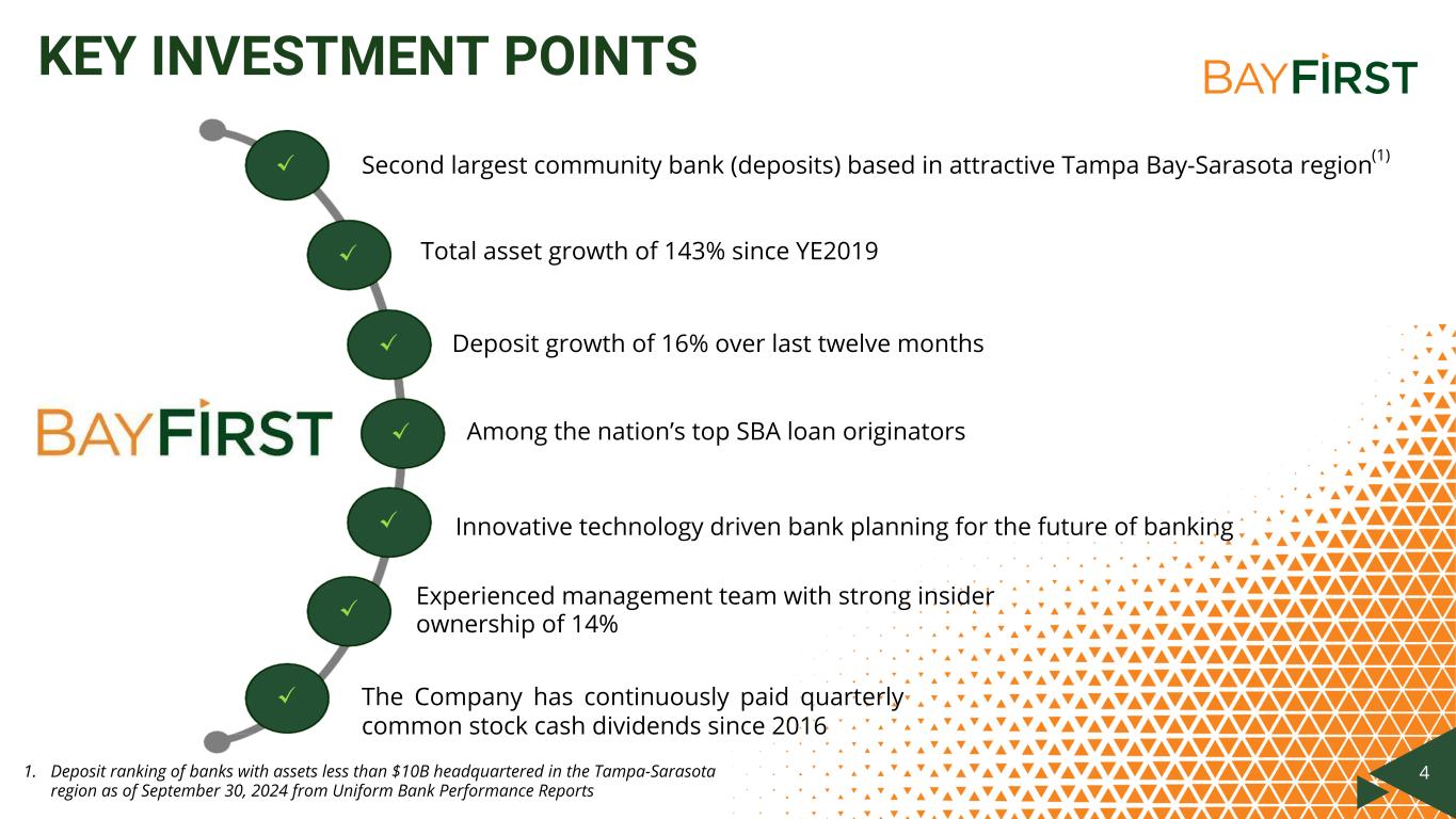 3 ABOUT BAYFIRST FINANCIAL CORP. TAMPA BAY’S PREMIER COMMUNITY BANKING FRANCHISE IN THE TAMPA BAY- SARASOTA REGION(1) HOW WE RANK 2 ASSET SIZE BILLION TOTAL ASSETS (2)$1.29 SBA ORIGINATION SBA 7(a) ORIGINATOR IN THE NATION BY UNITS (3) #9 ASSET GROWTH ASSET GROWTH SINCE DEC 31, 2019(2)143% (1) Deposit ranking of banks with assets less than $10B headquartered in the Tampa-Sarasota region as of September 30, 2024 from Uniform Bank Performance Reports (2) Financial data as of December 31, 2024 (3) As of SBA’s quarter ended December 31, 2024 (4) Forbes America’s Best in State Banks list published June 18, 2024 NET INTEREST MARGIN BASIS POINT IMPROVEMENT FROM THE PREVIOUS QUARTER26 DEPOSITS $158.1MILLION IN TOTAL DEPOSIT GROWTH OVER THE PAST YEAR(2) COMMUNITY BANKING Named the Best Bank in Florida in 2024(4)