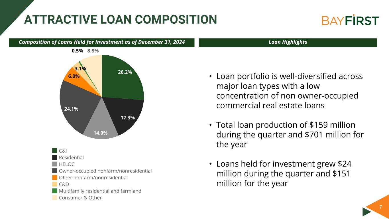 6 • Advanced technology platform to support innovative products and services while improving efficiencies • PowerLOS is an automated, highly scalable SBA and commercial loan origination system • Working with FinTechs to offer new and innovative services through Mulesoft API platform • 12 banking centers in Tampa Bay- Sarasota region • Full suite of commercial and consumer loan and deposit products to meet the needs of Tampa Bay individuals, families and small businesses • BayFirst’s in-house government guaranteed banking platform • #9 SBA lender in units and #16 in dollars as of SBA's quarter ended 12/31/24 ◦ Small Loan Balance program: ▪ Includes our Bolt loans up to $150K, with up to 85% SBA government guarantee • Core program: ▪ Traditional SBA loans over $150K and up to $5 million ▪ Supports organic loan generation through sales team and partners COMMUNITY BANKING TECHNOLOGY FOCUSED INNOVATIVE COMMUNITY BANK Technology focused community bank with diversified revenue streams GOVERNMENT GUARANTEED BANKING