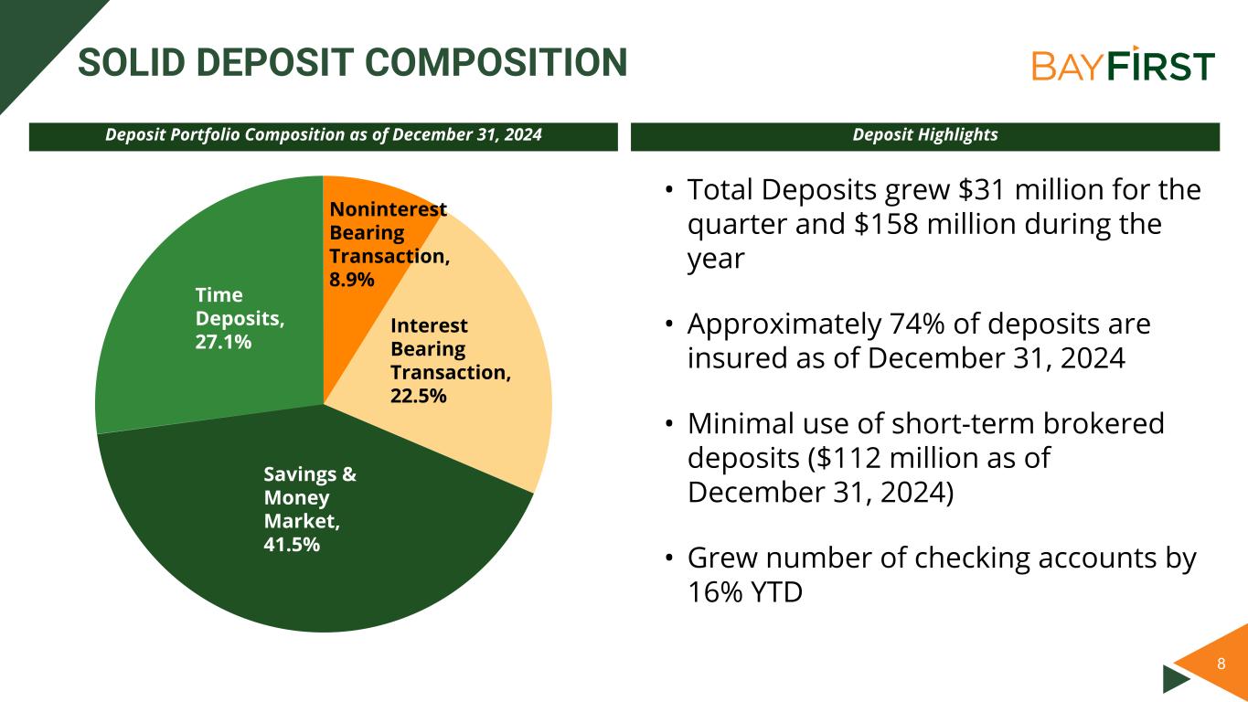 7 ATTRACTIVE LOAN COMPOSITION Composition of Loans Held for Investment as of December 31, 2024 26.2% 17.3% 14.0% 24.1% 6.0% 3.1% 0.5% 8.8% C&I Residential HELOC Owner-occupied nonfarm/nonresidential Other nonfarm/nonresidential C&D Multifamily residential and farmland Consumer & Other Loan Highlights • Loan portfolio is well-diversified across major loan types with a low concentration of non owner-occupied commercial real estate loans • Total loan production of $159 million during the quarter and $701 million for the year • Loans held for investment grew $24 million during the quarter and $151 million for the year