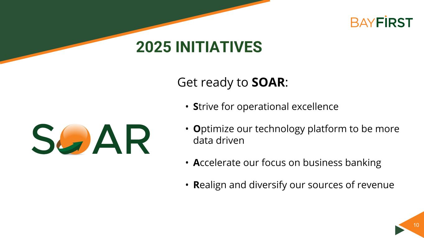 10 2025 INITIATIVES Get ready to SOAR: • Strive for operational excellence • Optimize our technology platform to be more data driven • Accelerate our focus on business banking • Realign and diversify our sources of revenue