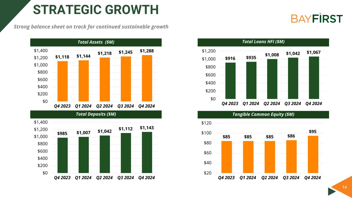 13 Q4 2024 As of and For the Three Months Ended As of and For the Year Ended 12/31/2024 9/30/2024 12/31/2023 12/31/2024 12/31/2023 Return on average assets(1) 3.07 % 0.37 % 0.60 % 1.05 % 0.54 % Return on average common equity(1) 42.71 % 3.48 % 6.37 % 12.84 % 5.87 % Tangible book value per common share $ 22.95 $ 20.86 $ 20.60 $ 22.95 $ 20.60 Diluted earnings per common share $ 2.11 $ 0.18 $ 0.32 $ 2.62 $ 1.12 Dividend payout ratio 3.52 % 43.98 % 25.03 % 11.96 % 27.70 % Total Capital (to risk-weighted assets)(2) 12.14 % 11.39 % 13.03 % 12.14 % 13.03 % Common Equity Tier 1 Capital (to risk- weighted assets)(2) 10.89 % 10.14 % 11.77 % 10.89 % 11.77 % Tier 1 Capital (to total assets)(2) 8.82 % 8.41 % 9.38 % 8.82 % 9.38 % Nonperforming loans (excl gov’t gtd balance)/total loans held for investment(3) 1.35 % 1.15 % 1.00 % 1.35 % 1.00 % ACL/Total loans held for investment at amortized cost 1.54 % 1.48 % 1.64 % 1.54 % 1.64 % (1) Annualized (2) Capital Ratios are at the Bank (3) Excludes loans measured at fair value