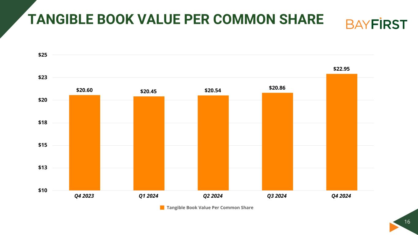 15 SUMMARY OF KEY RATIOS ROAA (%)(1) ROATCE (%)(1) Net Interest Margin (%)(1) Noninterest Income / Total Revenue from Continuing Operations 0.60% 0.29% 0.29% 0.37% 0.34% Q4 2023 Q1 2024 Q2 2024 Q3 2024 Q4 2024 0.00% 0.25% 0.50% 0.75% 6.37% 2.06% 2.26% 3.48% 4.93% Q4 2023 Q1 2024 Q2 2024 Q3 2024 Q4 2024 0.00% 2.50% 5.00% 7.50% 3.48% 3.42% 3.43% 3.34% 3.60% Q4 2023 Q1 2024 Q2 2024 Q3 2024 Q4 2024 0.00% 1.00% 2.00% 3.00% 4.00% 5.00% 62.33% 62.01% 55.93% 56.50% 49.94% Q4 2023 Q1 2024 Q2 2024 Q3 2024 Q4 2024 20% 30% 40% 50% 60% 70% (1) Annualized (2) Excludes gain on sale of premises and equipment of $11,649 ($8,692, net of tax) related to sale-leaseback transaction (2) (2) (2)