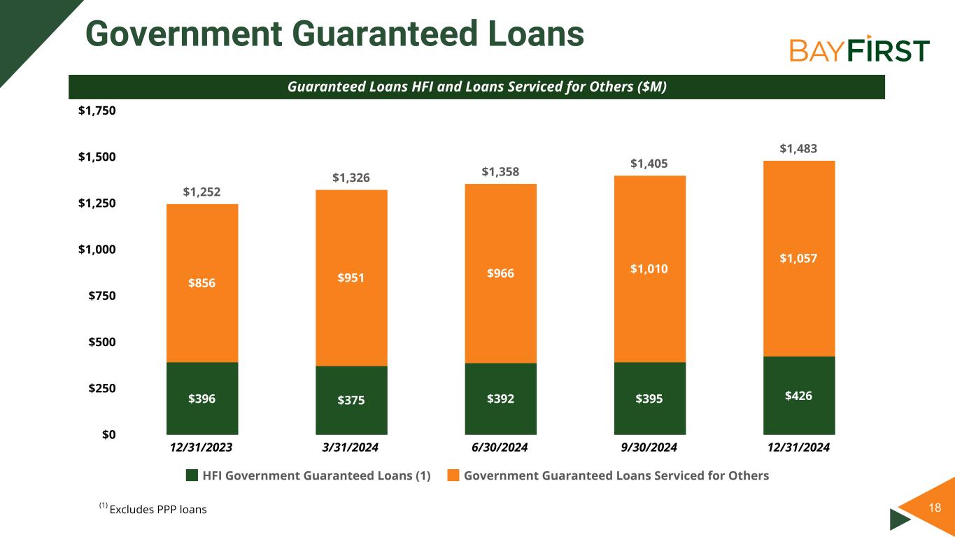 17 $145 $131 $99 $94 $108 849 809 603 553 543 Q4 2023 Q1 2024 Q2 2024 Q3 2024 Q4 2024 $0 $25 $50 $75 $100 $125 $150 500 550 600 650 700 750 800 850 900 • Nationally ranked #9 in total SBA units and #16 in dollars for the SBA’s quarter ended December 31, 2024 • Strategic initiative to expand USDA business and industry lending program: a total of 3 experienced USDA lenders to support this effort • Total Q4 2024 government guaranteed loan production decreased 25.6% from Q4 2023 as a result of tighter credit underwriting standards • The Company’s specialty Bolt program, an SBA 7(a) loan product designed to provide working capital loans of $150 thousand or less to businesses throughout the country ◦ Since the launch in June 2022, the Company originated loans totaling $741.5 million, including $64.8 million in Q4 2024 ◦ New automation program launched through proprietary loan origination system PowerLOS and Open API, allowing increased volume and efficiency while limiting additional staff GOVERNMENT GUARANTEED BANKING Q4 2024 Highlights Government Guaranteed Loan Amount ($M) and Unit Volume