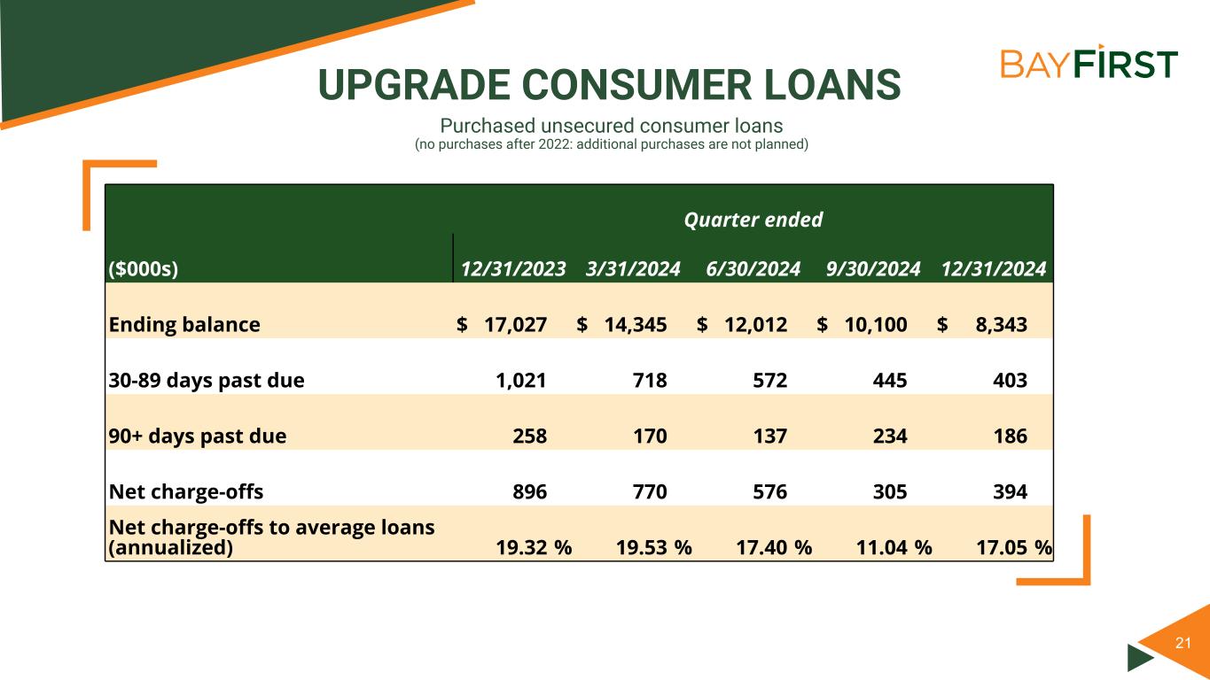 21 Quarter ended ($000s) 12/31/2023 3/31/2024 6/30/2024 9/30/2024 12/31/2024 Ending balance $ 17,027 $ 14,345 $ 12,012 $ 10,100 $ 8,343 30-89 days past due 1,021 718 572 445 403 90+ days past due 258 170 137 234 186 Net charge-offs 896 770 576 305 394 Net charge-offs to average loans (annualized) 19.32 % 19.53 % 17.40 % 11.04 % 17.05 % UPGRADE CONSUMER LOANS Purchased unsecured consumer loans (no purchases after 2022: additional purchases are not planned)