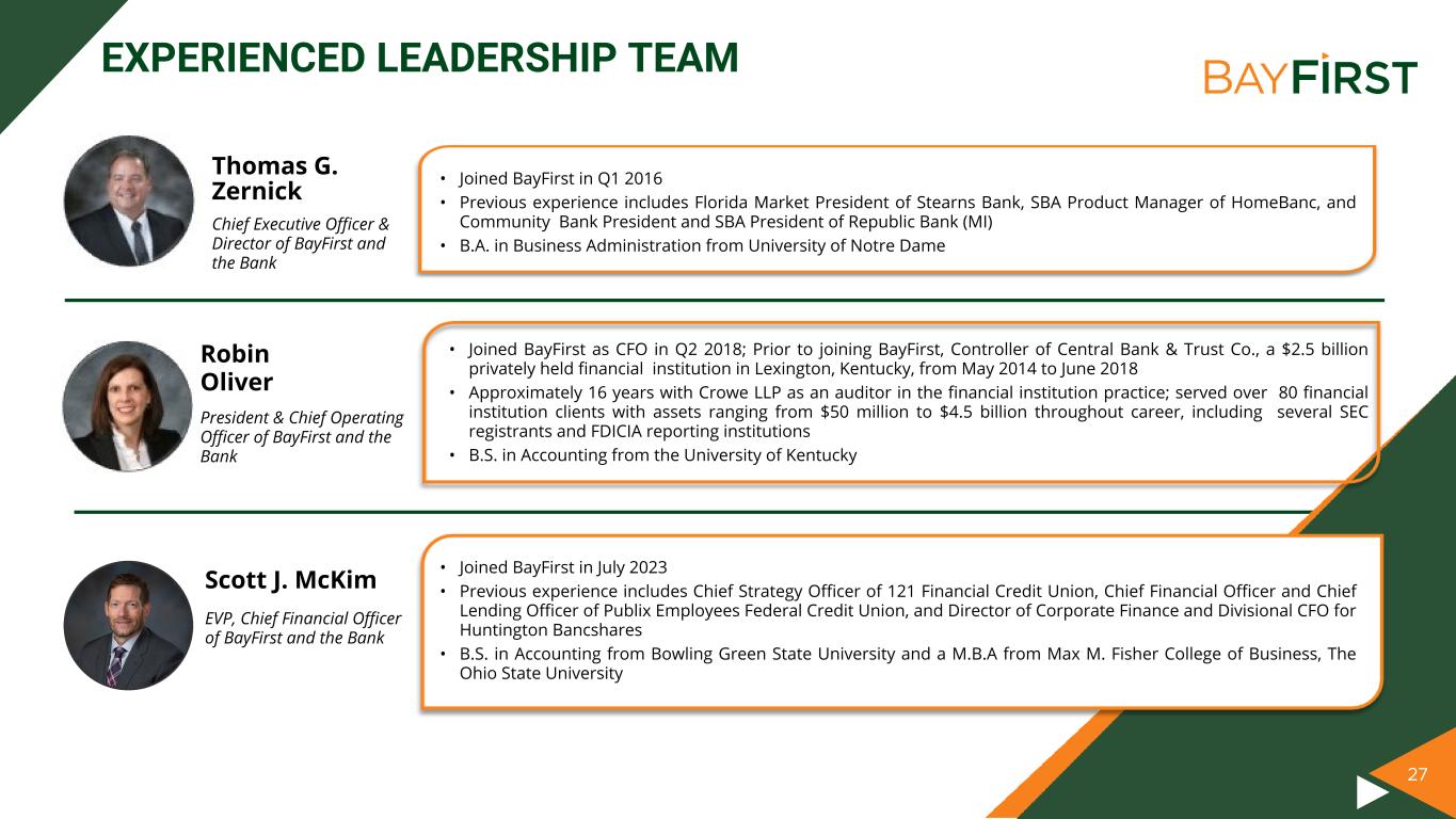 27 EXPERIENCED LEADERSHIP TEAM • Joined BayFirst as CFO in Q2 2018; Prior to joining BayFirst, Controller of Central Bank & Trust Co., a $2.5 billion privately held financial institution in Lexington, Kentucky, from May 2014 to June 2018 • Approximately 16 years with Crowe LLP as an auditor in the financial institution practice; served over 80 financial institution clients with assets ranging from $50 million to $4.5 billion throughout career, including several SEC registrants and FDICIA reporting institutions • B.S. in Accounting from the University of Kentucky • Joined BayFirst in Q1 2016 • Previous experience includes Florida Market President of Stearns Bank, SBA Product Manager of HomeBanc, and Community Bank President and SBA President of Republic Bank (MI) • B.A. in Business Administration from University of Notre Dame Robin Oliver Thomas G. Zernick Chief Executive Officer & Director of BayFirst and the Bank President & Chief Operating Officer of BayFirst and the Bank 27 Scott J. McKim EVP, Chief Financial Officer of BayFirst and the Bank • Joined BayFirst in July 2023 • Previous experience includes Chief Strategy Officer of 121 Financial Credit Union, Chief Financial Officer and Chief Lending Officer of Publix Employees Federal Credit Union, and Director of Corporate Finance and Divisional CFO for Huntington Bancshares • B.S. in Accounting from Bowling Green State University and a M.B.A from Max M. Fisher College of Business, The Ohio State University