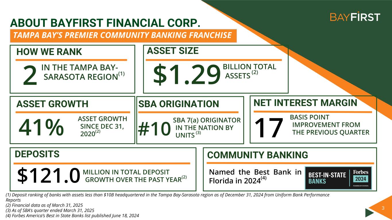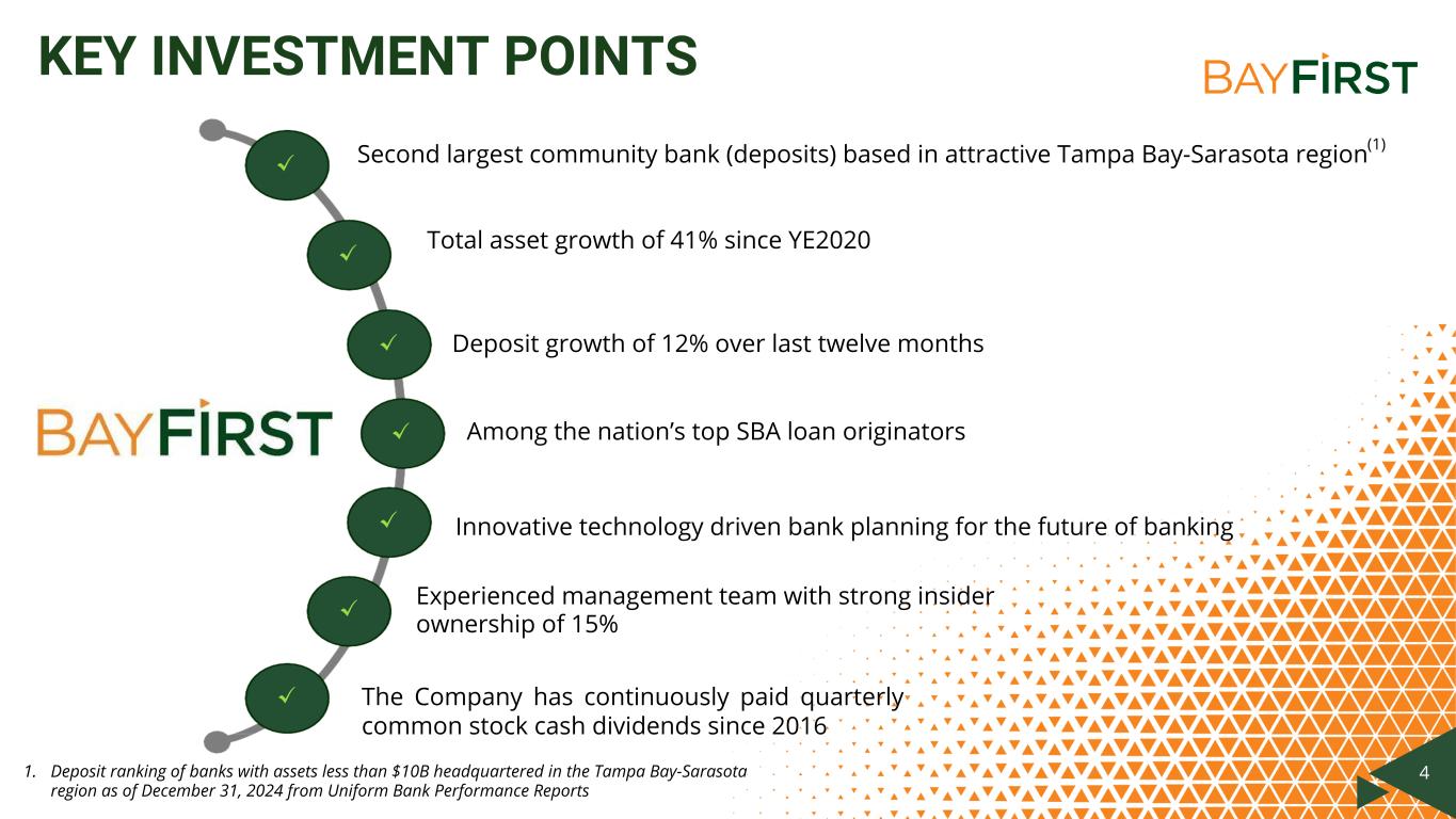 3 ABOUT BAYFIRST FINANCIAL CORP. TAMPA BAY’S PREMIER COMMUNITY BANKING FRANCHISE IN THE TAMPA BAY- SARASOTA REGION(1) HOW WE RANK 2 ASSET SIZE BILLION TOTAL ASSETS (2)$1.29 SBA ORIGINATION SBA 7(a) ORIGINATOR IN THE NATION BY UNITS (3) #10 ASSET GROWTH ASSET GROWTH SINCE DEC 31, 2020(2)41% (1) Deposit ranking of banks with assets less than $10B headquartered in the Tampa Bay-Sarasota region as of December 31, 2024 from Uniform Bank Performance Reports (2) Financial data as of March 31, 2025 (3) As of SBA’s quarter ended March 31, 2025 (4) Forbes America’s Best in State Banks list published June 18, 2024 NET INTEREST MARGIN BASIS POINT IMPROVEMENT FROM THE PREVIOUS QUARTER17 DEPOSITS $121.0 MILLION IN TOTAL DEPOSIT GROWTH OVER THE PAST YEAR(2) COMMUNITY BANKING Named the Best Bank in Florida in 2024(4)