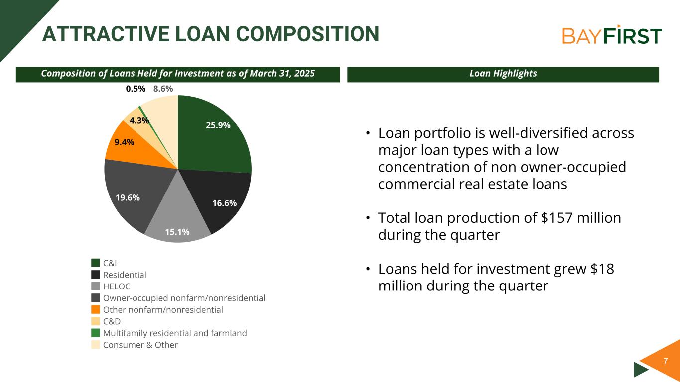 6 • Advanced technology platform to support innovative products and services while improving efficiencies • PowerLOS is an automated, highly scalable SBA and commercial loan origination system • Working with FinTechs to offer new and innovative services through Mulesoft API platform • 12 banking centers in Tampa Bay- Sarasota region • Full suite of commercial and consumer loan and deposit products to meet the needs of Tampa Bay individuals, families and small businesses • BayFirst’s in-house government guaranteed banking platform • #10 SBA lender in units and #19 in dollars as of SBA's quarter ended 3/31/25 ◦ Small Loan Balance program: ▪ Includes our Bolt loans up to $150K, with up to 85% SBA government guarantee • Core program: ▪ Traditional SBA loans over $150K and up to $5 million ▪ USDA loans up to $25 million ▪ Supports organic loan generation through sales team and partners COMMUNITY BANKING TECHNOLOGY FOCUSED INNOVATIVE COMMUNITY BANK Technology focused community bank with diversified revenue streams GOVERNMENT GUARANTEED BANKING