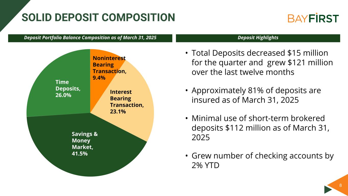 7 ATTRACTIVE LOAN COMPOSITION Composition of Loans Held for Investment as of March 31, 2025 25.9% 16.6% 15.1% 19.6% 9.4% 4.3% 0.5% 8.6% C&I Residential HELOC Owner-occupied nonfarm/nonresidential Other nonfarm/nonresidential C&D Multifamily residential and farmland Consumer & Other Loan Highlights • Loan portfolio is well-diversified across major loan types with a low concentration of non owner-occupied commercial real estate loans • Total loan production of $157 million during the quarter • Loans held for investment grew $18 million during the quarter