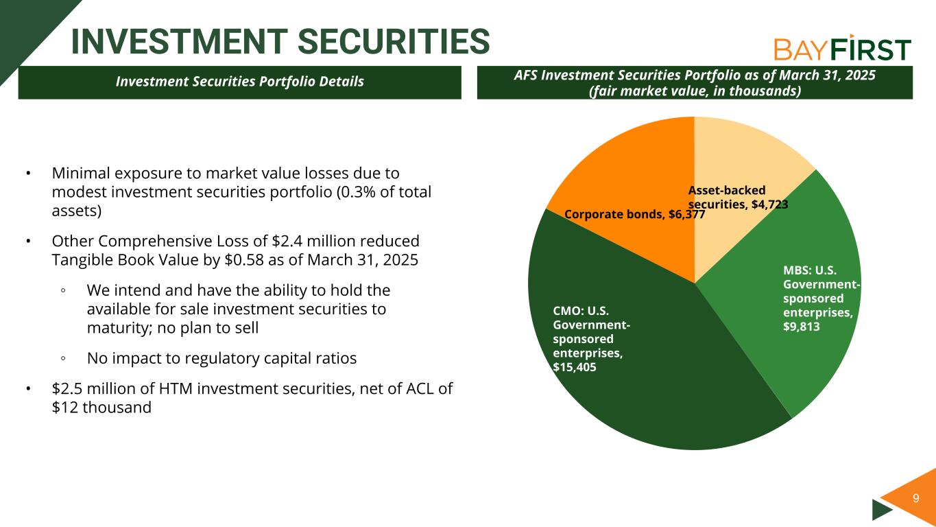 8 SOLID DEPOSIT COMPOSITION Deposit Portfolio Balance Composition as of March 31, 2025 • Total Deposits decreased $15 million for the quarter and grew $121 million over the last twelve months • Approximately 81% of deposits are insured as of March 31, 2025 • Minimal use of short-term brokered deposits $112 million as of March 31, 2025 • Grew number of checking accounts by 2% YTD Noninterest Bearing Transaction, 9.4% Interest Bearing Transaction, 23.1% Savings & Money Market, 41.5% Time Deposits, 26.0% Deposit Highlights