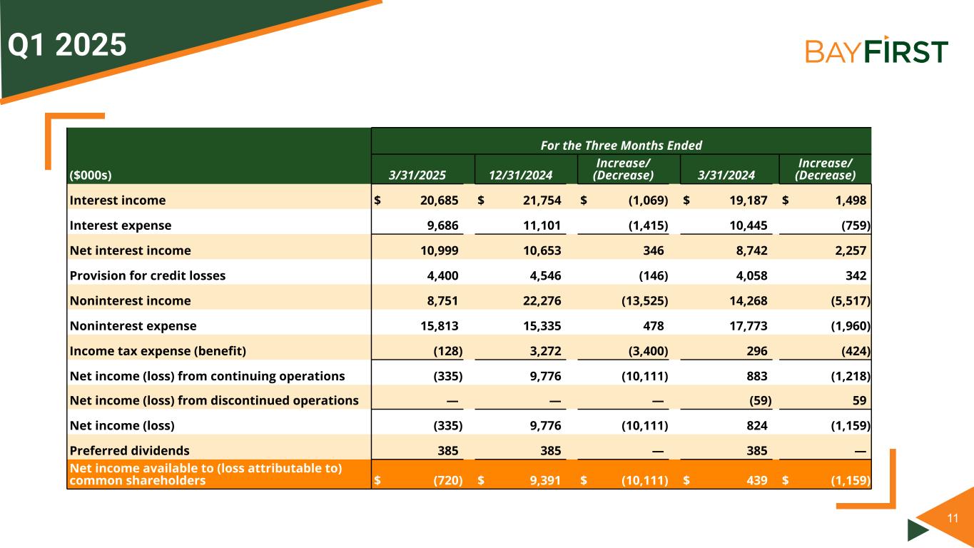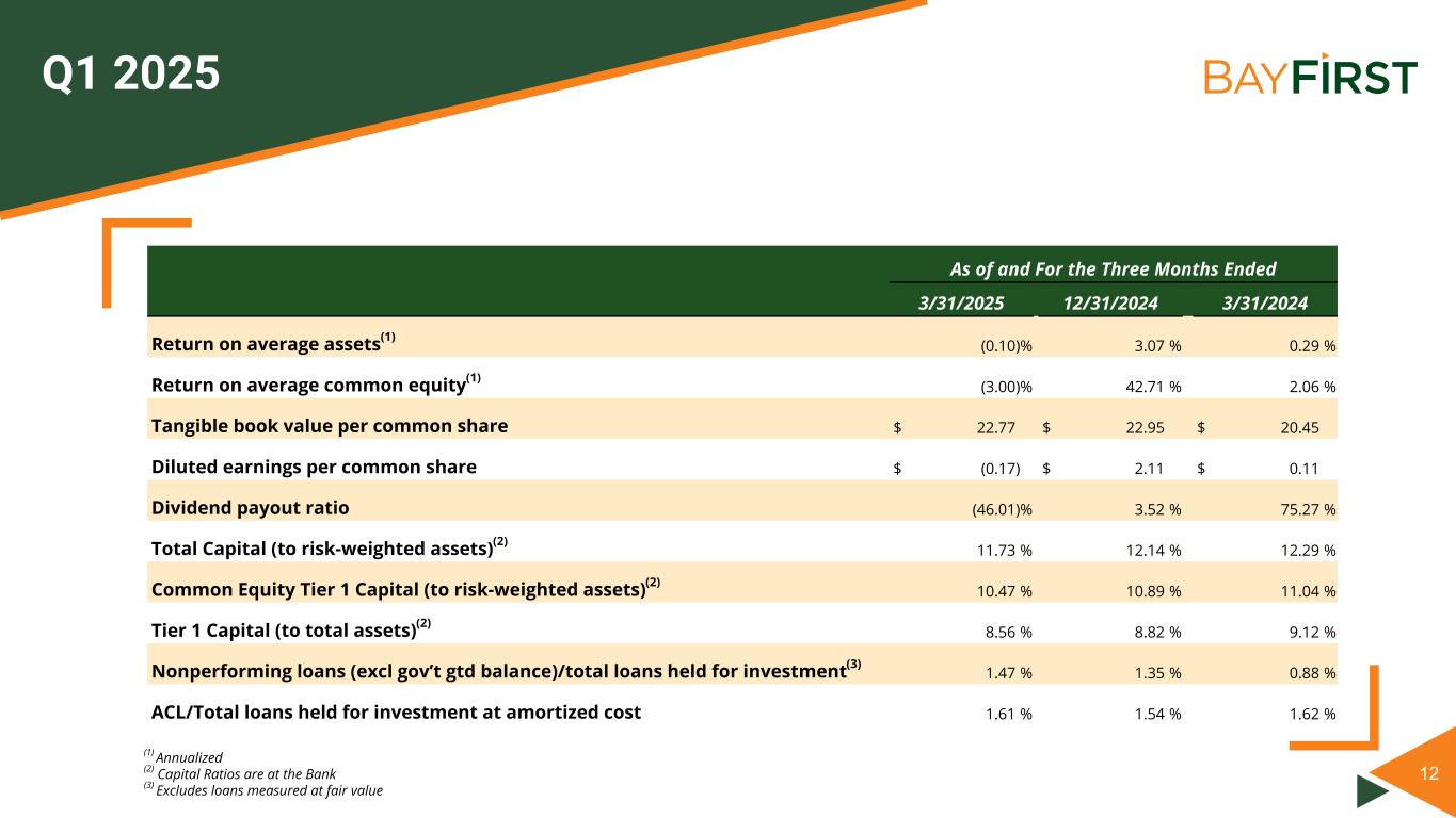 11 Q1 2025 For the Three Months Ended ($000s) 3/31/2025 12/31/2024 Increase/ (Decrease) 3/31/2024 Increase/ (Decrease) Interest income $ 20,685 $ 21,754 $ (1,069) $ 19,187 $ 1,498 Interest expense 9,686 11,101 (1,415) 10,445 (759) Net interest income 10,999 10,653 346 8,742 2,257 Provision for credit losses 4,400 4,546 (146) 4,058 342 Noninterest income 8,751 22,276 (13,525) 14,268 (5,517) Noninterest expense 15,813 15,335 478 17,773 (1,960) Income tax expense (benefit) (128) 3,272 (3,400) 296 (424) Net income (loss) from continuing operations (335) 9,776 (10,111) 883 (1,218) Net income (loss) from discontinued operations — — — (59) 59 Net income (loss) (335) 9,776 (10,111) 824 (1,159) Preferred dividends 385 385 — 385 — Net income available to (loss attributable to) common shareholders $ (720) $ 9,391 $ (10,111) $ 439 $ (1,159)