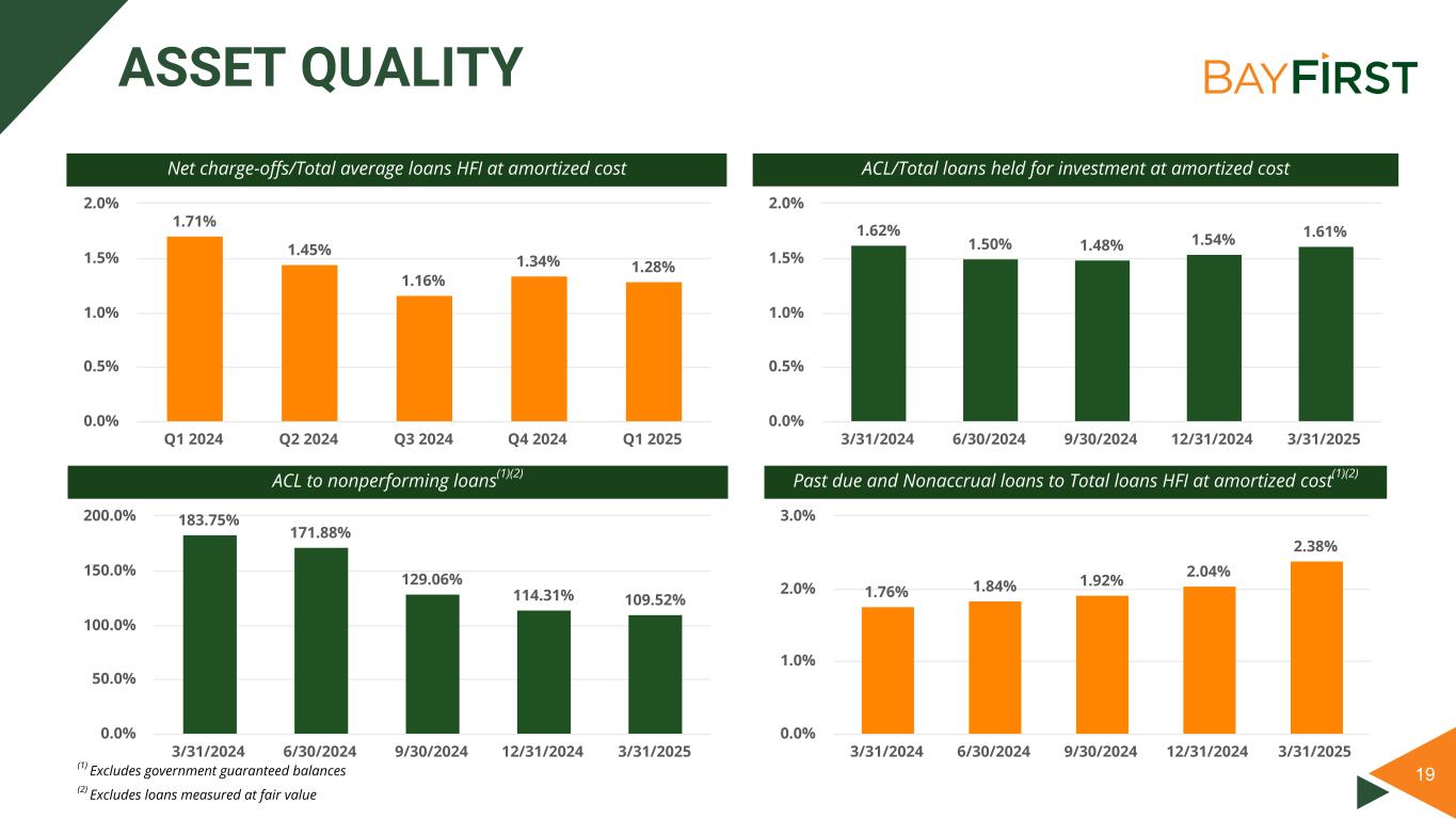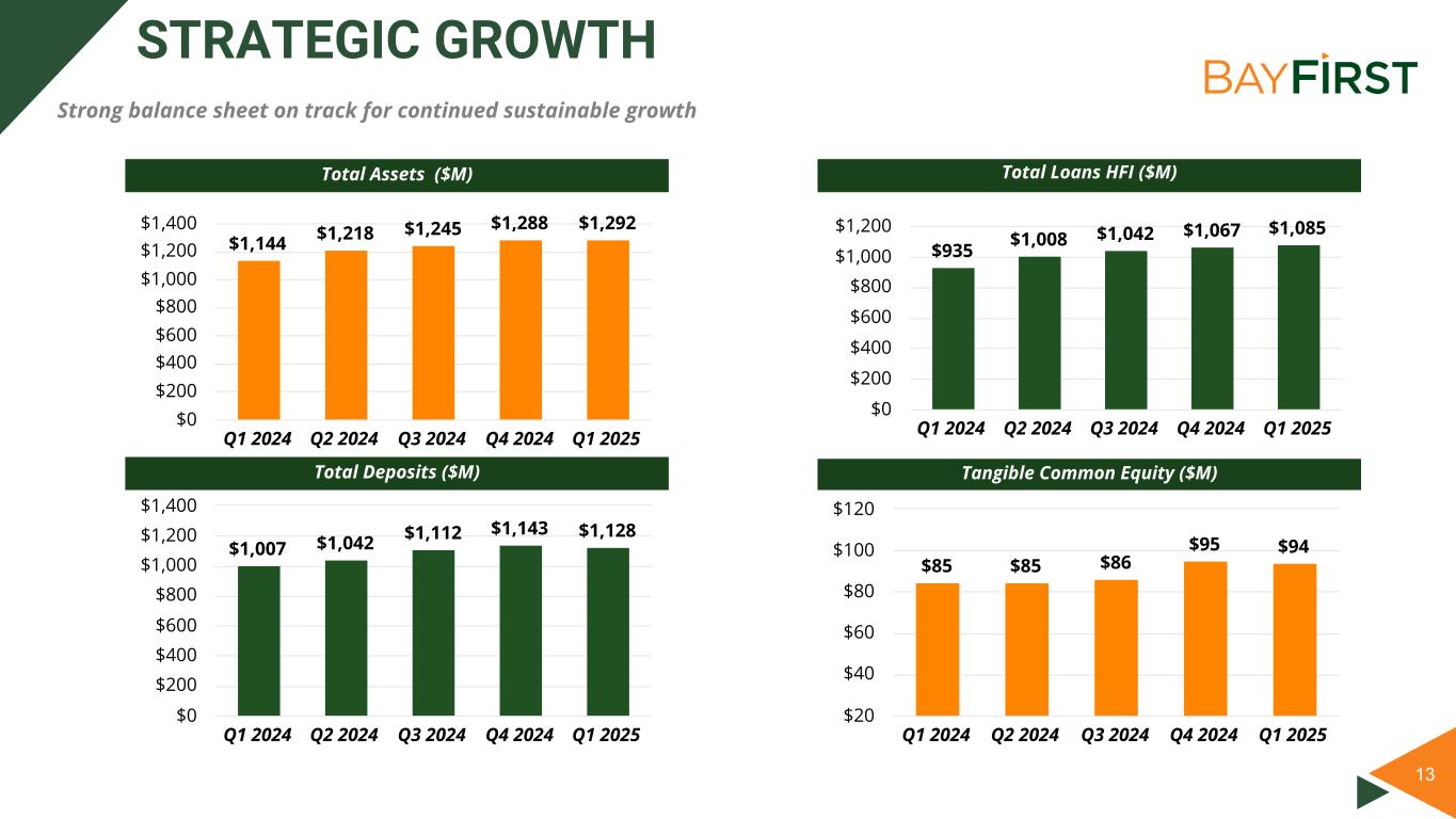 12 Q1 2025 As of and For the Three Months Ended 3/31/2025 12/31/2024 3/31/2024 Return on average assets(1) (0.10) % 3.07 % 0.29 % Return on average common equity(1) (3.00) % 42.71 % 2.06 % Tangible book value per common share $ 22.77 $ 22.95 $ 20.45 Diluted earnings per common share $ (0.17) $ 2.11 $ 0.11 Dividend payout ratio (46.01) % 3.52 % 75.27 % Total Capital (to risk-weighted assets)(2) 11.73 % 12.14 % 12.29 % Common Equity Tier 1 Capital (to risk-weighted assets)(2) 10.47 % 10.89 % 11.04 % Tier 1 Capital (to total assets)(2) 8.56 % 8.82 % 9.12 % Nonperforming loans (excl gov’t gtd balance)/total loans held for investment(3) 1.47 % 1.35 % 0.88 % ACL/Total loans held for investment at amortized cost 1.61 % 1.54 % 1.62 % (1) Annualized (2) Capital Ratios are at the Bank (3) Excludes loans measured at fair value