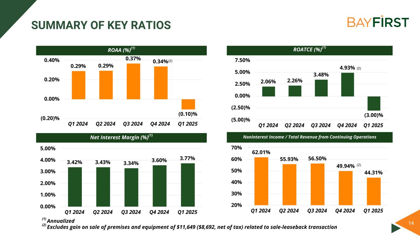 13 $85 $85 $86 $95 $94 Q1 2024 Q2 2024 Q3 2024 Q4 2024 Q1 2025 $20 $40 $60 $80 $100 $120 Strong balance sheet on track for continued sustainable growth STRATEGIC GROWTH Total Assets ($M) Total Loans HFI ($M) Total Deposits ($M) Tangible Common Equity ($M) $1,144 $1,218 $1,245 $1,288 $1,292 Q1 2024 Q2 2024 Q3 2024 Q4 2024 Q1 2025 $0 $200 $400 $600 $800 $1,000 $1,200 $1,400 $935 $1,008 $1,042 $1,067 $1,085 Q1 2024 Q2 2024 Q3 2024 Q4 2024 Q1 2025 $0 $200 $400 $600 $800 $1,000 $1,200 $1,007 $1,042 $1,112 $1,143 $1,128 Q1 2024 Q2 2024 Q3 2024 Q4 2024 Q1 2025 $0 $200 $400 $600 $800 $1,000 $1,200 $1,400