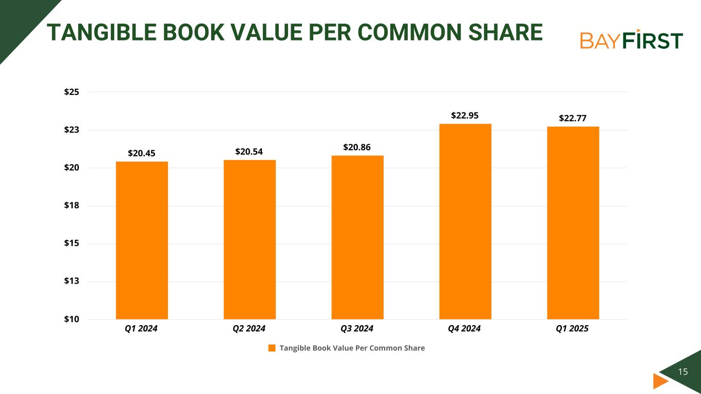 14 SUMMARY OF KEY RATIOS ROAA (%)(1) ROATCE (%)(1) Net Interest Margin (%)(1) Noninterest Income / Total Revenue from Continuing Operations 0.29% 0.29% 0.37% 0.34% (0.10)% Q1 2024 Q2 2024 Q3 2024 Q4 2024 Q1 2025 (0.20)% 0.00% 0.20% 0.40% 2.06% 2.26% 3.48% 4.93% (3.00)% Q1 2024 Q2 2024 Q3 2024 Q4 2024 Q1 2025 (5.00)% (2.50)% 0.00% 2.50% 5.00% 7.50% 3.42% 3.43% 3.34% 3.60% 3.77% Q1 2024 Q2 2024 Q3 2024 Q4 2024 Q1 2025 0.00% 1.00% 2.00% 3.00% 4.00% 5.00% 62.01% 55.93% 56.50% 49.94% 44.31% Q1 2024 Q2 2024 Q3 2024 Q4 2024 Q1 2025 20% 30% 40% 50% 60% 70% (1) Annualized (2) Excludes gain on sale of premises and equipment of $11,649 ($8,692, net of tax) related to sale-leaseback transaction (2) (2) (2)