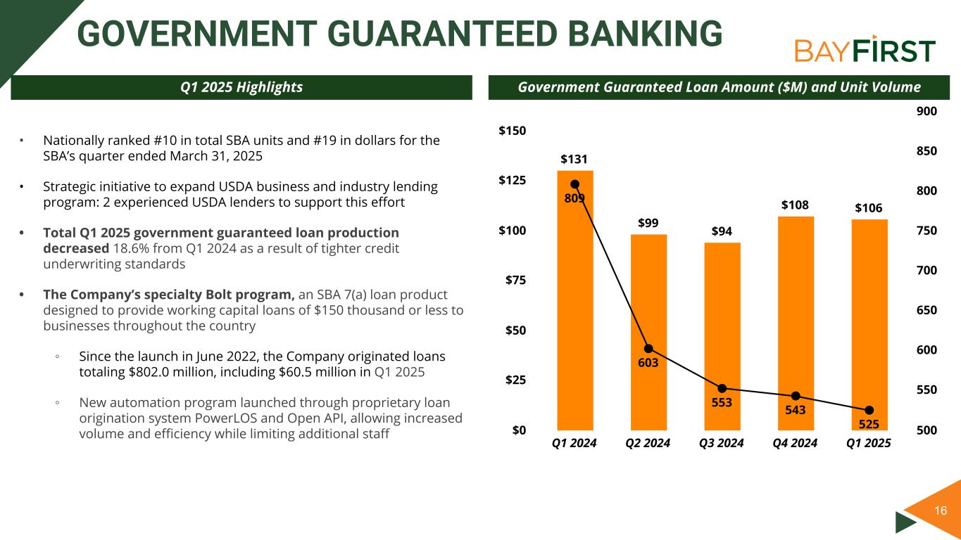 15 TANGIBLE BOOK VALUE PER COMMON SHARE $20.45 $20.54 $20.86 $22.95 $22.77 Tangible Book Value Per Common Share Q1 2024 Q2 2024 Q3 2024 Q4 2024 Q1 2025 $10 $13 $15 $18 $20 $23 $25