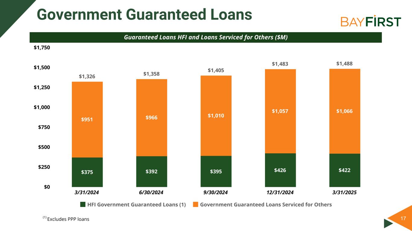 16 $131 $99 $94 $108 $106 809 603 553 543 525 Q1 2024 Q2 2024 Q3 2024 Q4 2024 Q1 2025 $0 $25 $50 $75 $100 $125 $150 500 550 600 650 700 750 800 850 900 • Nationally ranked #10 in total SBA units and #19 in dollars for the SBA’s quarter ended March 31, 2025 • Strategic initiative to expand USDA business and industry lending program: 2 experienced USDA lenders to support this effort • Total Q1 2025 government guaranteed loan production decreased 18.6% from Q1 2024 as a result of tighter credit underwriting standards • The Company’s specialty Bolt program, an SBA 7(a) loan product designed to provide working capital loans of $150 thousand or less to businesses throughout the country ◦ Since the launch in June 2022, the Company originated loans totaling $802.0 million, including $60.5 million in Q1 2025 ◦ New automation program launched through proprietary loan origination system PowerLOS and Open API, allowing increased volume and efficiency while limiting additional staff GOVERNMENT GUARANTEED BANKING Q1 2025 Highlights Government Guaranteed Loan Amount ($M) and Unit Volume