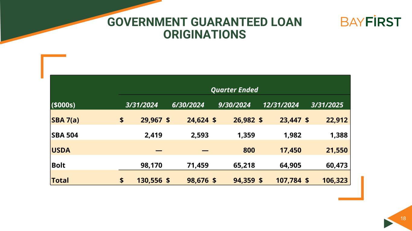 17 $1,326 $1,358 $1,405 $1,483 $1,488 $375 $392 $395 $426 $422 $951 $966 $1,010 $1,057 $1,066 HFI Government Guaranteed Loans (1) Government Guaranteed Loans Serviced for Others 3/31/2024 6/30/2024 9/30/2024 12/31/2024 3/31/2025 $0 $250 $500 $750 $1,000 $1,250 $1,500 $1,750 Government Guaranteed Loans Guaranteed Loans HFI and Loans Serviced for Others ($M) (1) Excludes PPP loans