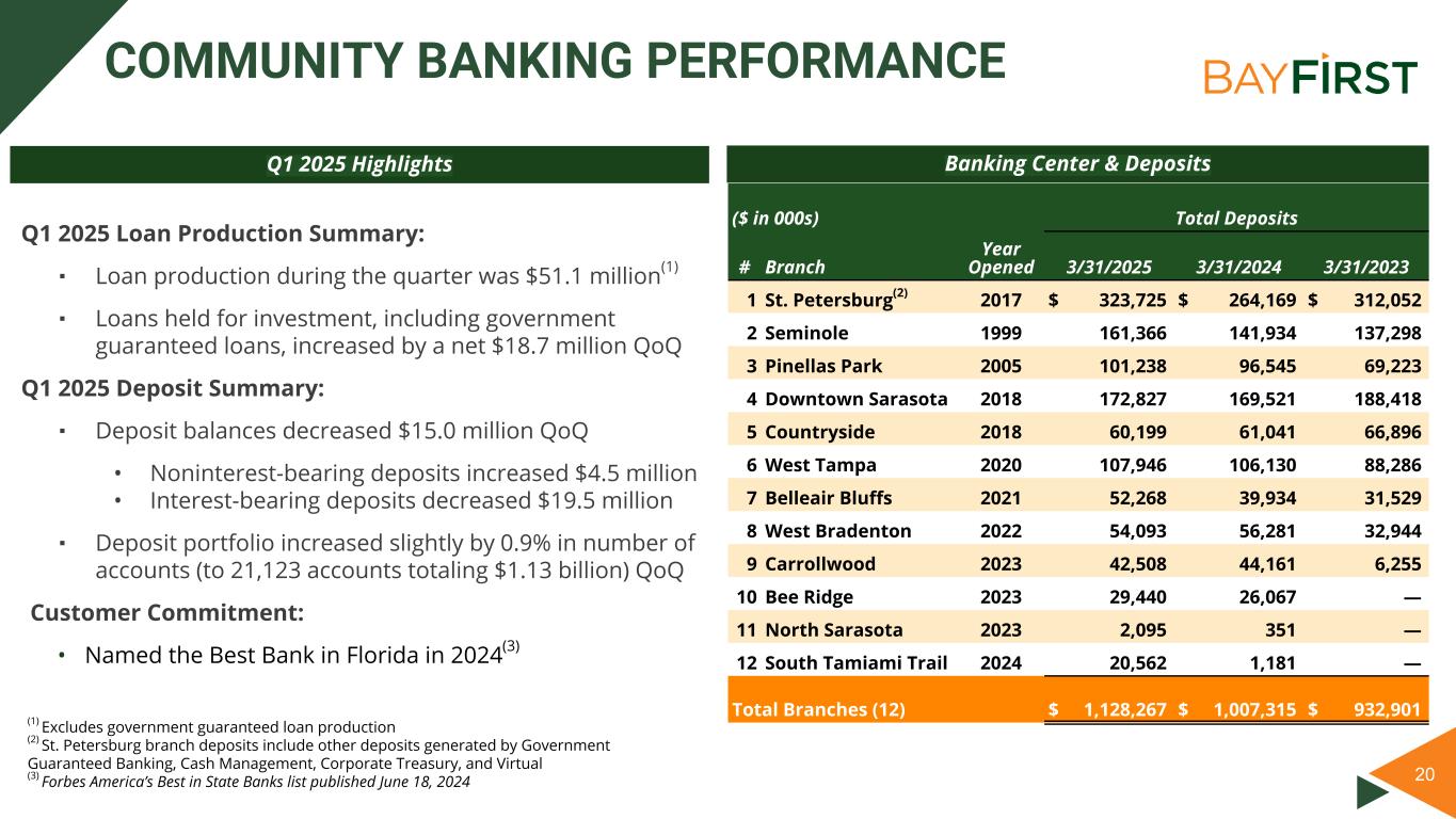 20 COMMUNITY BANKING PERFORMANCE Q1 2025 Loan Production Summary: ▪ Loan production during the quarter was $51.1 million(1) ▪ Loans held for investment, including government guaranteed loans, increased by a net $18.7 million QoQ Q1 2025 Deposit Summary: ▪ Deposit balances decreased $15.0 million QoQ • Noninterest-bearing deposits increased $4.5 million • Interest-bearing deposits decreased $19.5 million ▪ Deposit portfolio increased slightly by 0.9% in number of accounts (to 21,123 accounts totaling $1.13 billion) QoQ Customer Commitment: • Named the Best Bank in Florida in 2024(3) Q1 2025 Highlights Banking Center & Deposits ($ in 000s) Total Deposits # Branch Year Opened 3/31/2025 3/31/2024 3/31/2023 1 St. Petersburg(2) 2017 $ 323,725 $ 264,169 $ 312,052 2 Seminole 1999 161,366 141,934 137,298 3 Pinellas Park 2005 101,238 96,545 69,223 4 Downtown Sarasota 2018 172,827 169,521 188,418 5 Countryside 2018 60,199 61,041 66,896 6 West Tampa 2020 107,946 106,130 88,286 7 Belleair Bluffs 2021 52,268 39,934 31,529 8 West Bradenton 2022 54,093 56,281 32,944 9 Carrollwood 2023 42,508 44,161 6,255 10 Bee Ridge 2023 29,440 26,067 — 11 North Sarasota 2023 2,095 351 — 12 South Tamiami Trail 2024 20,562 1,181 — Total Branches (12) $ 1,128,267 $ 1,007,315 $ 932,901 (1) Excludes government guaranteed loan production (2) St. Petersburg branch deposits include other deposits generated by Government Guaranteed Banking, Cash Management, Corporate Treasury, and Virtual (3) Forbes America’s Best in State Banks list published June 18, 2024