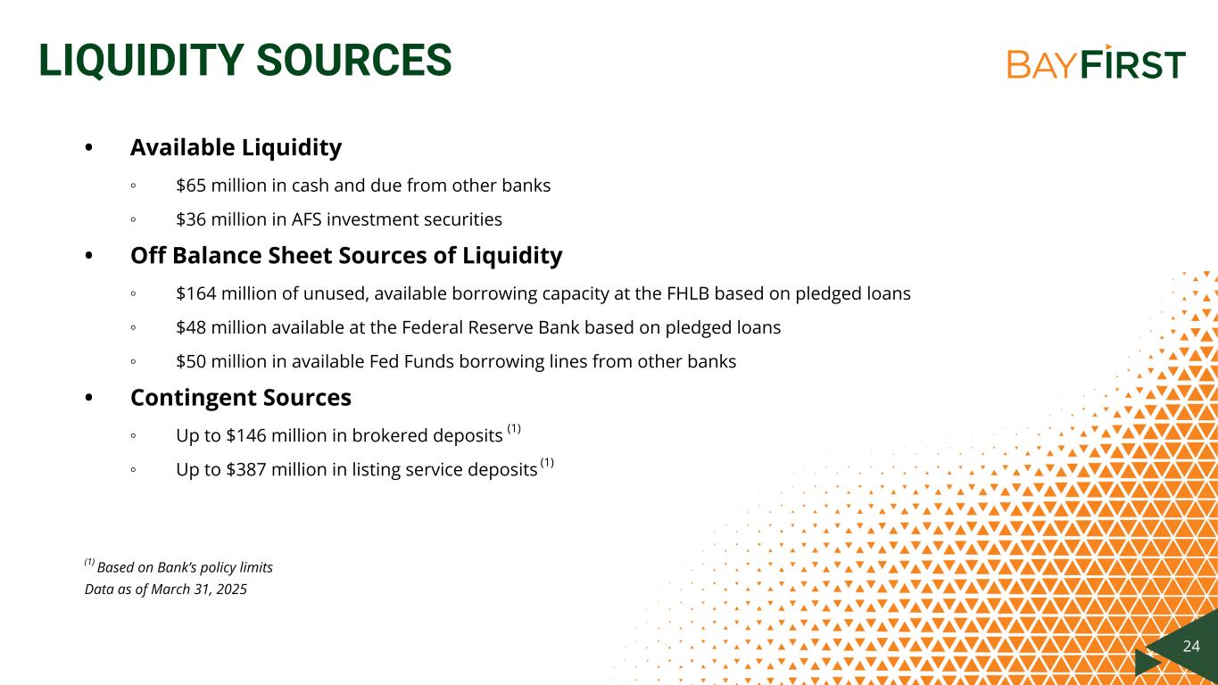 No content below the lineNo content below the line Data color order: Used with accent colors: Complimentary colors: 24 LIQUIDITY SOURCES • Available Liquidity ◦ $65 million in cash and due from other banks ◦ $36 million in AFS investment securities • Off Balance Sheet Sources of Liquidity ◦ $164 million of unused, available borrowing capacity at the FHLB based on pledged loans ◦ $48 million available at the Federal Reserve Bank based on pledged loans ◦ $50 million in available Fed Funds borrowing lines from other banks • Contingent Sources ◦ Up to $146 million in brokered deposits (1) ◦ Up to $387 million in listing service deposits (1) (1) Based on Bank’s policy limits Data as of March 31, 2025