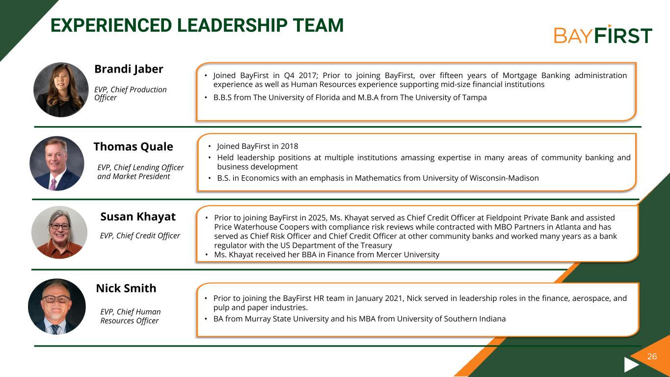 25 EXPERIENCED LEADERSHIP TEAM • Joined BayFirst as CFO in Q2 2018; Prior to joining BayFirst, Controller of Central Bank & Trust Co., a $2.5 billion privately held financial institution in Lexington, Kentucky, from May 2014 to June 2018 • Approximately 16 years with Crowe LLP as an auditor in the financial institution practice; served over 80 financial institution clients with assets ranging from $50 million to $4.5 billion throughout career, including several SEC registrants and FDICIA reporting institutions • B.S. in Accounting from the University of Kentucky • Joined BayFirst in Q1 2016 • Previous experience includes Florida Market President of Stearns Bank, SBA Product Manager of HomeBanc, and Community Bank President and SBA President of Republic Bank (MI) • B.A. in Business Administration from University of Notre Dame Robin Oliver Thomas G. Zernick Chief Executive Officer & Director of BayFirst and the Bank President & Chief Operating Officer of BayFirst and the Bank 25 Scott J. McKim EVP, Chief Financial Officer of BayFirst and the Bank • Joined BayFirst in July 2023 • Previous experience includes Chief Strategy Officer of 121 Financial Credit Union, Chief Financial Officer and Chief Lending Officer of Publix Employees Federal Credit Union, and Director of Corporate Finance and Divisional CFO for Huntington Bancshares • B.S. in Accounting from Bowling Green State University and a M.B.A from Max M. Fisher College of Business, The Ohio State University