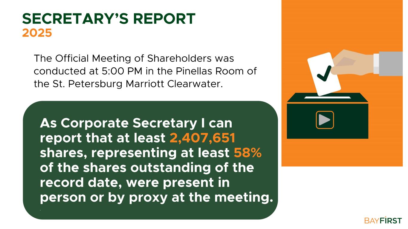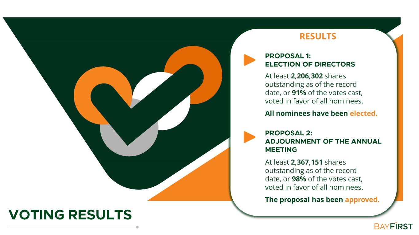 At least 2,206,302 shares outstanding as of the record date, or 91% of the votes cast, voted in favor of all nominees. RESULTS All nominees have been elected. At least 2,367,151 shares outstanding as of the record date, or 98% of the votes cast, voted in favor of all nominees. The proposal has been approved.