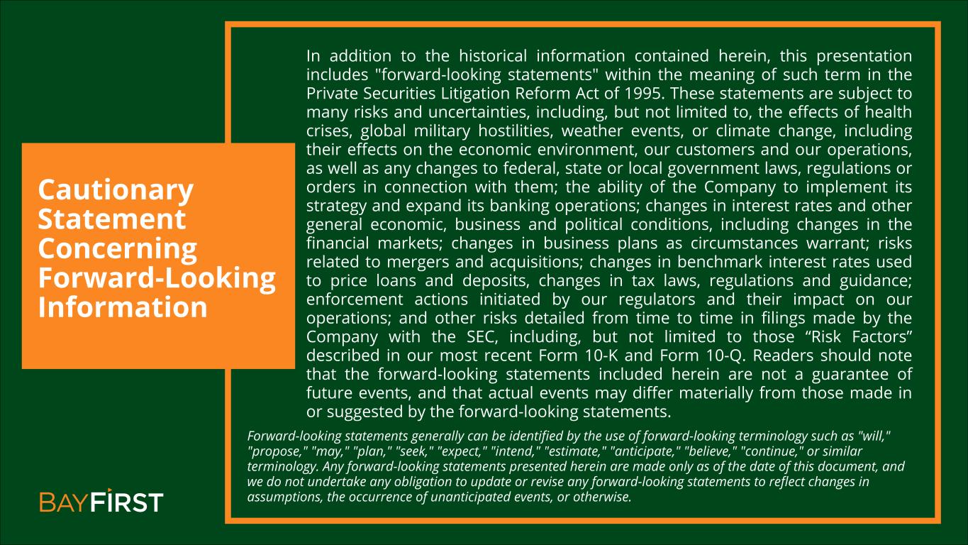 In addition to the historical information contained herein, this presentation includes "forward-looking statements" within the meaning of such term in the Private Securities Litigation Reform Act of 1995. These statements are subject to many risks and uncertainties, including, but not limited to, the effects of health crises, global military hostilities, weather events, or climate change, including their effects on the economic environment, our customers and our operations, as well as any changes to federal, state or local government laws, regulations or orders in connection with them; the ability of the Company to implement its strategy and expand its banking operations; changes in interest rates and other general economic, business and political conditions, including changes in the financial markets; changes in business plans as circumstances warrant; risks related to mergers and acquisitions; changes in benchmark interest rates used to price loans and deposits, changes in tax laws, regulations and guidance; enforcement actions initiated by our regulators and their impact on our operations; and other risks detailed from time to time in filings made by the Company with the SEC, including, but not limited to those “Risk Factors” described in our most recent Form 10-K and Form 10-Q. Readers should note that the forward-looking statements included herein are not a guarantee of future events, and that actual events may differ materially from those made in or suggested by the forward-looking statements. Cautionary Statement Concerning Forward-Looking Information Forward-looking statements generally can be identified by the use of forward-looking terminology such as "will," "propose," "may," "plan," "seek," "expect," "intend," "estimate," "anticipate," "believe," "continue," or similar terminology. Any forward-looking statements presented herein are made only as of the date of this document, and we do not undertake any obligation to update or revise any forward-looking statements to reflect changes in assumptions, the occurrence of unanticipated events, or otherwise.