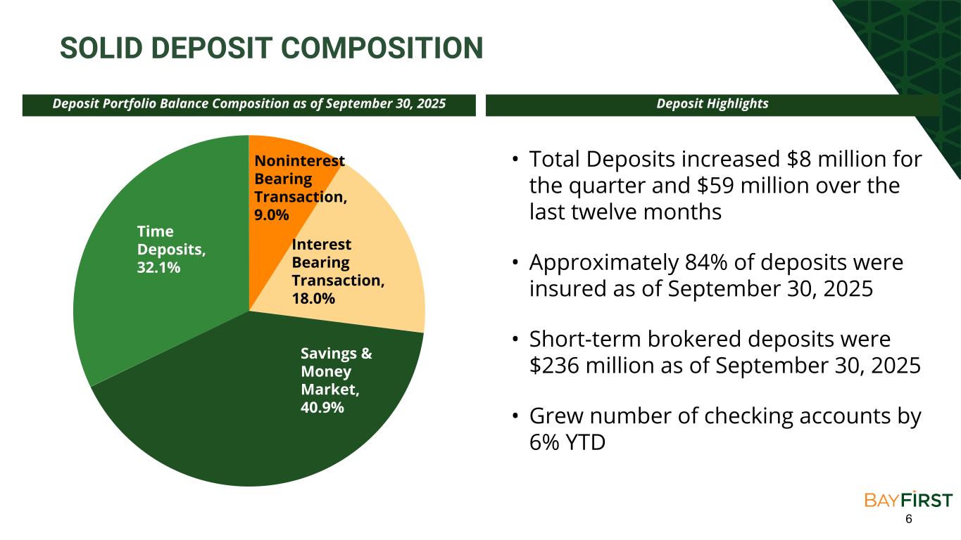 5 ATTRACTIVE LOAN COMPOSITION Composition of Loans Held for Investment as of September 30, 2025 24.9% 17.9% 18.9% 15.1% 8.9% 4.4% 0.7% 9.2% C&I Residential HELOC Owner-occupied nonfarm/nonresidential Other nonfarm/nonresidential C&D Multifamily residential and farmland Consumer & Other Loan Highlights • Loan portfolio is well-diversified across major loan types with a low concentration of non owner-occupied commercial real estate loans • Total loan production of $75 million during the quarter • Total loans (held for sale and held for investment) grew $50 million over the last twelve months