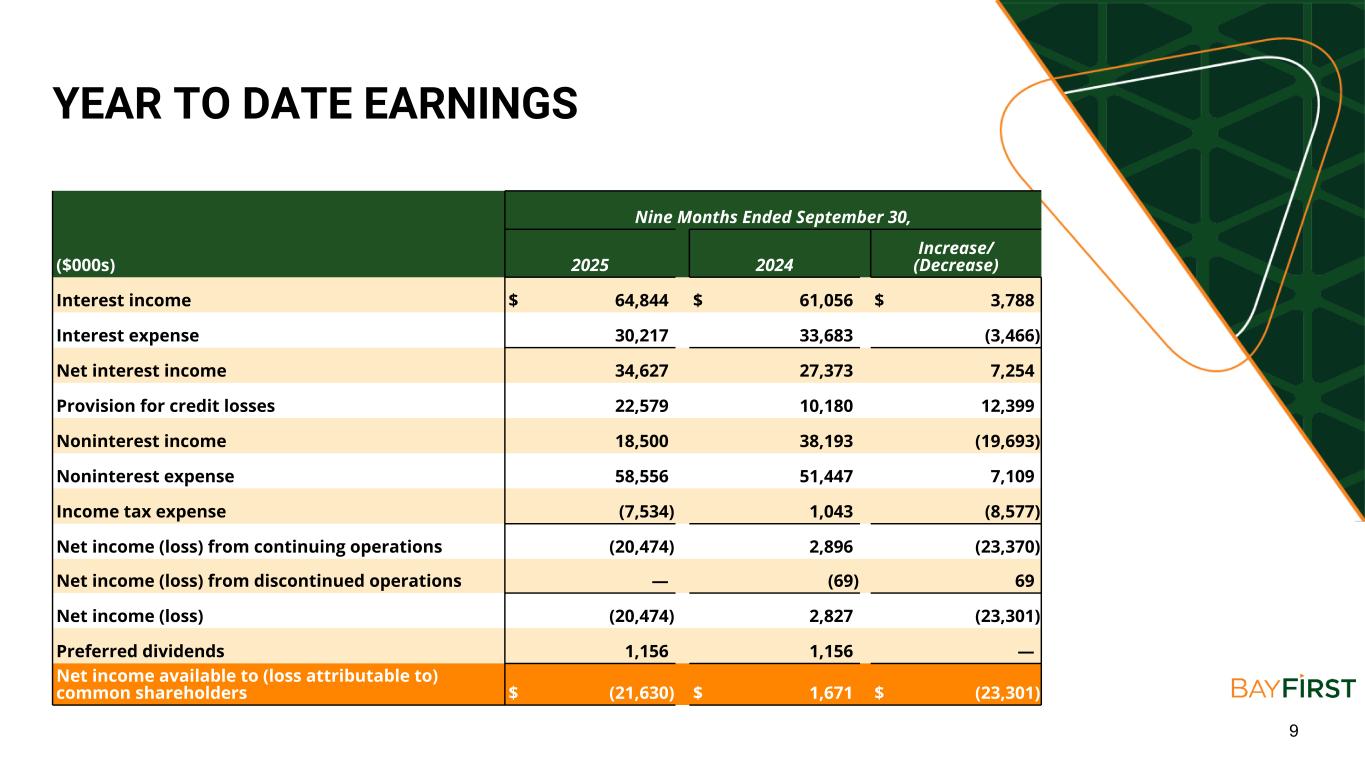 8 QUARTERLY EARNINGS For the Three Months Ended ($000s) 9/30/2025 6/30/2025 Increase/ (Decrease) 9/30/2024 Increase/ (Decrease) Interest income $ 21,654 $ 22,505 $ (851) $ 21,442 $ 212 Interest expense 10,374 10,157 217 11,993 (1,619) Net interest income 11,280 12,348 (1,068) 9,449 1,831 Provision for credit losses 10,915 7,264 3,651 3,122 7,793 Noninterest income (1,046) 10,795 (11,841) 12,272 (13,318) Noninterest expense 25,215 17,528 7,687 17,064 8,151 Income tax expense (benefit) (6,994) (412) (6,582) 398 (7,392) Net income (loss) from continuing operations (18,902) (1,237) (17,665) 1,137 (20,039) Net income (loss) from discontinued operations — — — — — Net income (loss) (18,902) (1,237) (17,665) 1,137 (20,039) Preferred dividends 385 386 (1) 385 — Net income available to (loss attributable to) common shareholders $ (19,287) $ (1,623) $ (17,664) $ 752 $ (20,039)