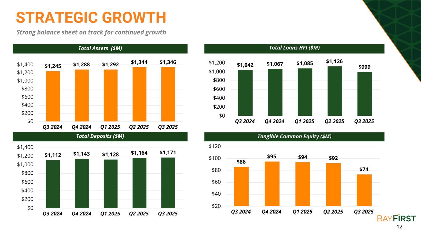 11 QTD INTEREST MARGIN 3.34% 3.60% 3.77% 4.06% 3.61% Q3 2024 Q4 2024 Q1 2025 Q2 2025 Q3 2025 0.0% 2.0% 4.0% 6.0% Net Interest Margin Loan Yield 7.84% 7.64% 7.37% 7.67% 7.20% Q3 2024 Q4 2024 Q1 2025 Q2 2025 Q3 2025 0.0% 2.5% 5.0% 7.5% 10.0% Cost of Funds Net Interest Margin ($ in millions) 4.68% 4.19% 3.76% 3.75% 3.71% Q3 2024 Q4 2024 Q1 2025 Q2 2025 Q3 2025 0.0% 2.0% 4.0% 6.0% $9.4 $10.7 $11.0 $12.3 $11.3 Q3 2024 Q4 2024 Q1 2025 Q2 2025 Q3 2025 $0.0 $5.0 $10.0 $15.0