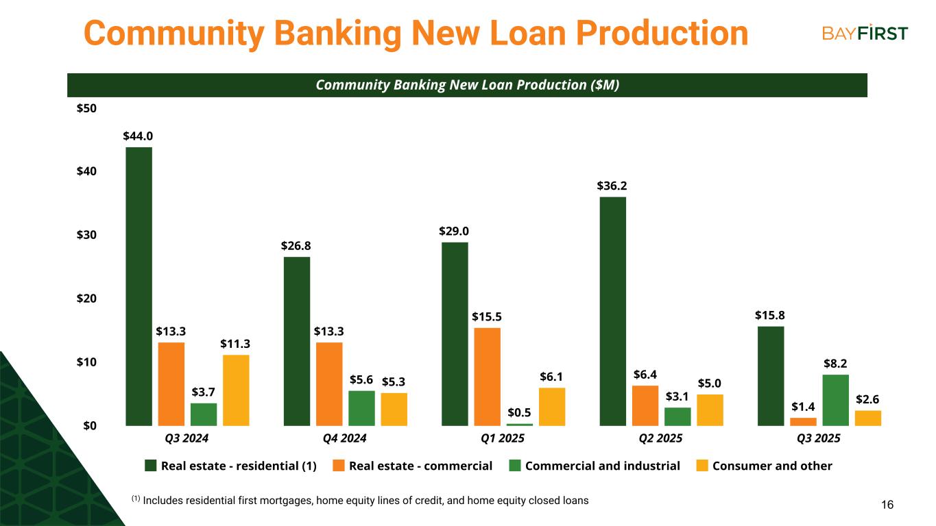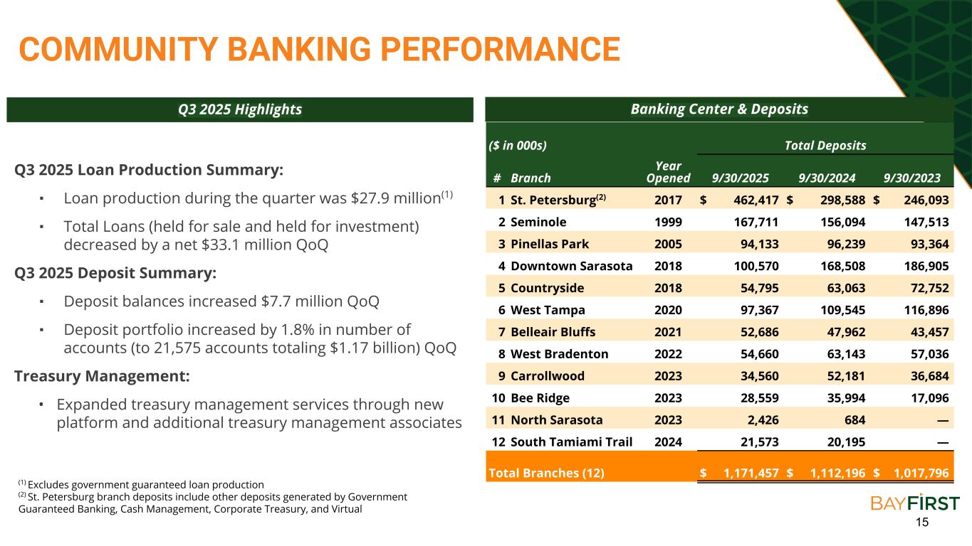 15 COMMUNITY BANKING PERFORMANCE Q3 2025 Loan Production Summary: ▪ Loan production during the quarter was $27.9 million(1) ▪ Total Loans (held for sale and held for investment) decreased by a net $33.1 million QoQ Q3 2025 Deposit Summary: ▪ Deposit balances increased $7.7 million QoQ ▪ Deposit portfolio increased by 1.8% in number of accounts (to 21,575 accounts totaling $1.17 billion) QoQ Treasury Management: • Expanded treasury management services through new platform and additional treasury management associates Q3 2025 Highlights Banking Center & Deposits ($ in 000s) Total Deposits # Branch Year Opened 9/30/2025 9/30/2024 9/30/2023 1 St. Petersburg(2) 2017 $ 462,417 $ 298,588 $ 246,093 2 Seminole 1999 167,711 156,094 147,513 3 Pinellas Park 2005 94,133 96,239 93,364 4 Downtown Sarasota 2018 100,570 168,508 186,905 5 Countryside 2018 54,795 63,063 72,752 6 West Tampa 2020 97,367 109,545 116,896 7 Belleair Bluffs 2021 52,686 47,962 43,457 8 West Bradenton 2022 54,660 63,143 57,036 9 Carrollwood 2023 34,560 52,181 36,684 10 Bee Ridge 2023 28,559 35,994 17,096 11 North Sarasota 2023 2,426 684 — 12 South Tamiami Trail 2024 21,573 20,195 — Total Branches (12) $ 1,171,457 $ 1,112,196 $ 1,017,796 (1) Excludes government guaranteed loan production (2) St. Petersburg branch deposits include other deposits generated by Government Guaranteed Banking, Cash Management, Corporate Treasury, and Virtual
