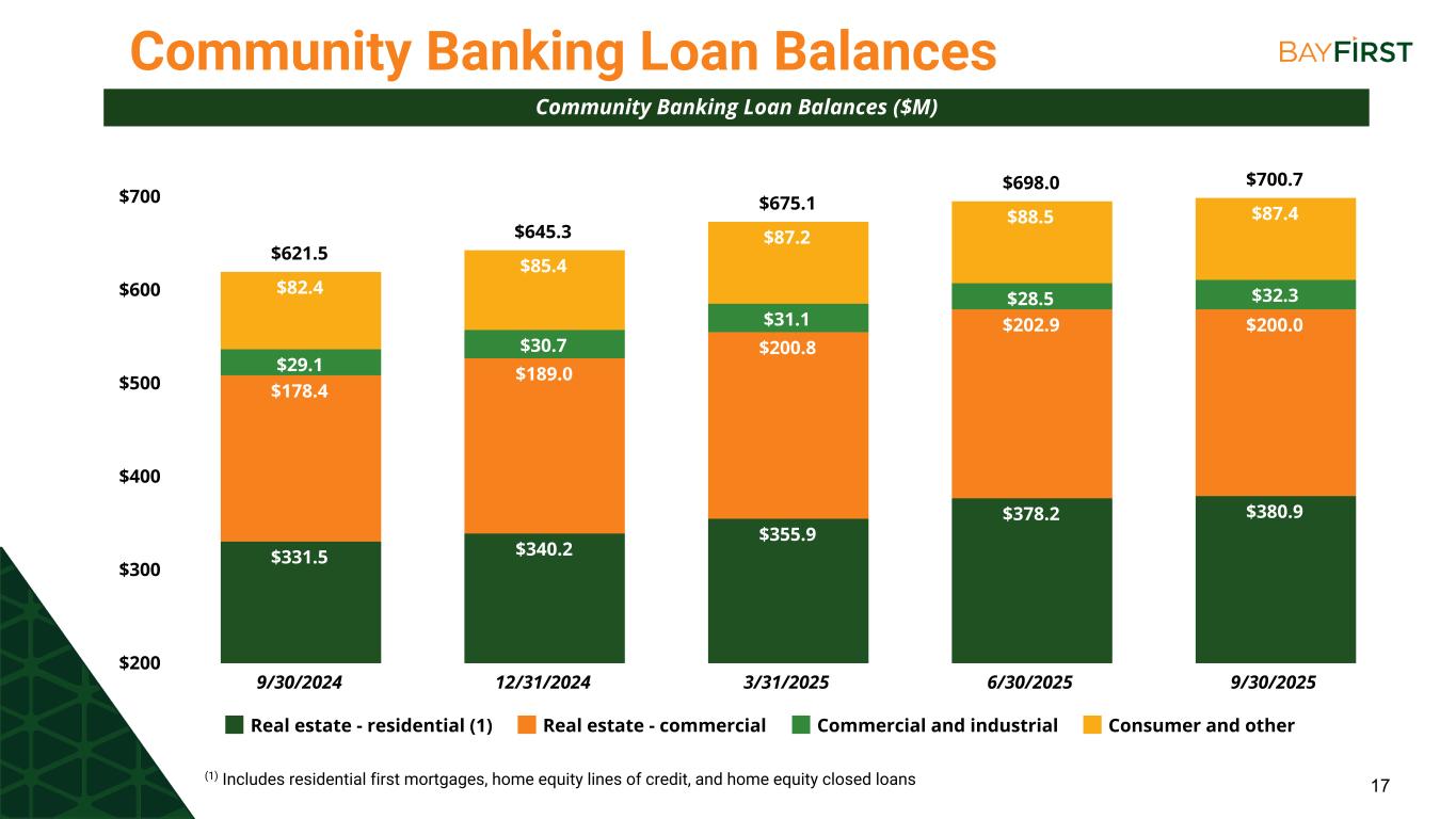 16 $44.0 $26.8 $29.0 $36.2 $15.8 $13.3 $13.3 $15.5 $6.4 $1.4 $3.7 $5.6 $0.5 $3.1 $8.2 $11.3 $5.3 $6.1 $5.0 $2.6 Real estate - residential (1) Real estate - commercial Commercial and industrial Consumer and other Q3 2024 Q4 2024 Q1 2025 Q2 2025 Q3 2025 $0 $10 $20 $30 $40 $50 Community Banking New Loan Production Community Banking New Loan Production ($M) (1) Includes residential first mortgages, home equity lines of credit, and home equity closed loans