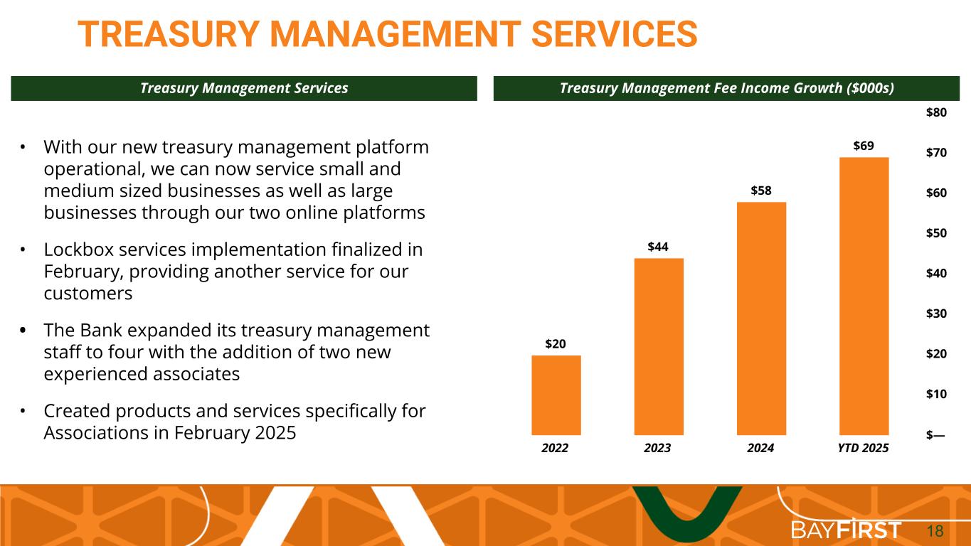 18 $20 $44 $58 $69 2022 2023 2024 YTD 2025 $— $10 $20 $30 $40 $50 $60 $70 $80 • With our new treasury management platform operational, we can now service small and medium sized businesses as well as large businesses through our two online platforms • Lockbox services implementation finalized in February, providing another service for our customers • The Bank expanded its treasury management staff to four with the addition of two new experienced associates • Created products and services specifically for Associations in February 2025 TREASURY MANAGEMENT SERVICES Treasury Management Services Treasury Management Fee Income Growth ($000s)