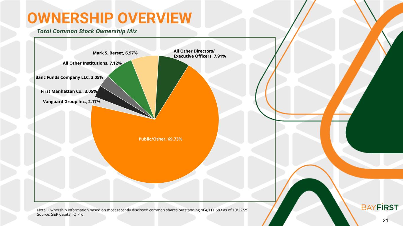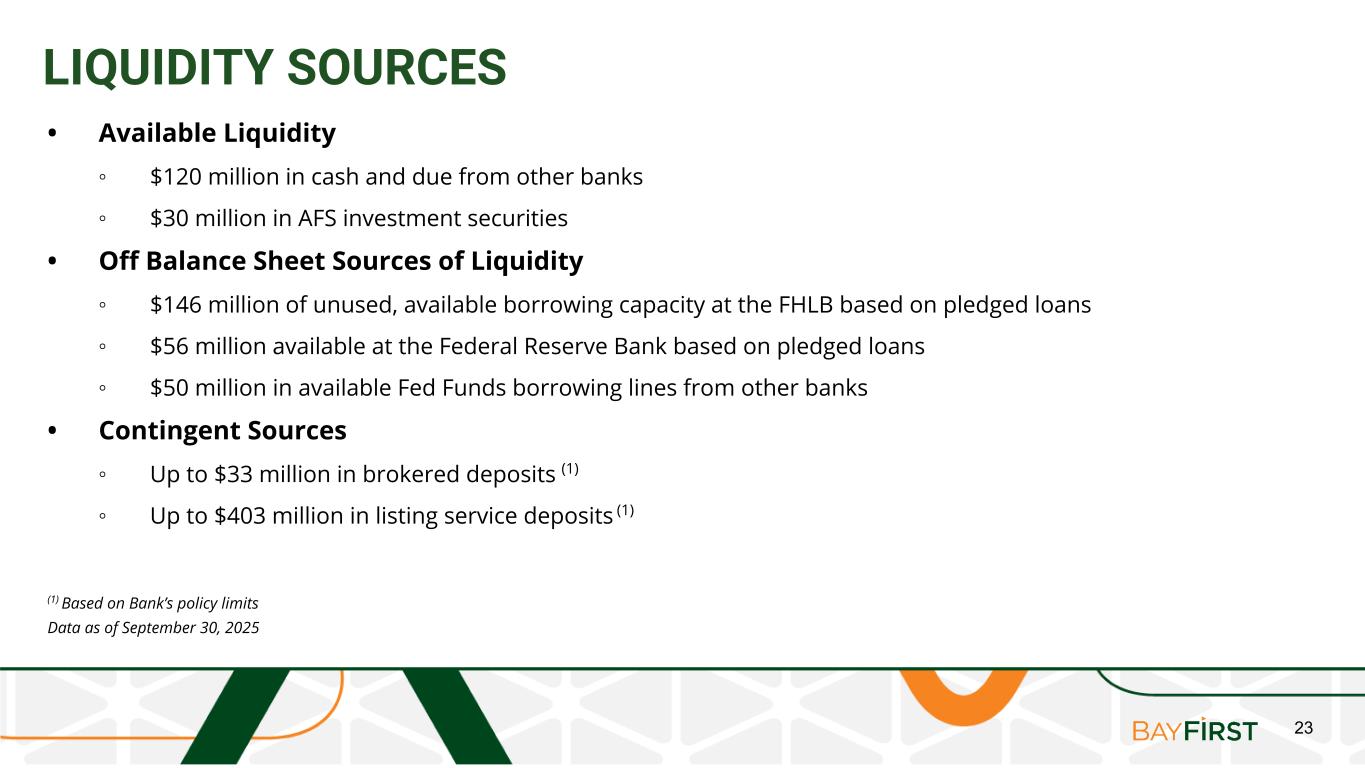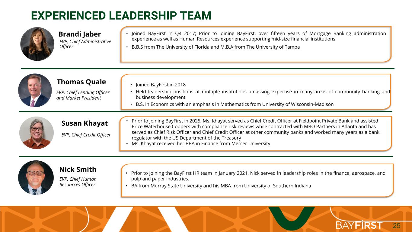 24 EXPERIENCED LEADERSHIP TEAM • Joined BayFirst as CFO in Q2 2018; Prior to joining BayFirst, Controller of Central Bank & Trust Co., a $2.5 billion privately held financial institution in Lexington, Kentucky, from May 2014 to June 2018 • Approximately 16 years with Crowe LLP as an auditor in the financial institution practice; served over 80 financial institution clients with assets ranging from $50 million to $4.5 billion throughout career, including several SEC registrants and FDICIA reporting institutions • B.S. in Accounting from the University of Kentucky • Joined BayFirst in Q1 2016 • Previous experience includes Florida Market President of Stearns Bank, SBA Product Manager of HomeBanc, and Community Bank President and SBA President of Republic Bank (MI) • B.A. in Business Administration from University of Notre Dame Robin Oliver Thomas G. Zernick Chief Executive Officer & Director of BayFirst and the Bank President, Chief Operating Officer & Director of BayFirst and the Bank Scott J. McKim EVP, Chief Financial Officer of BayFirst and the Bank • Joined BayFirst in July 2023 • Previous experience includes Chief Strategy Officer of 121 Financial Credit Union, Chief Financial Officer and Chief Lending Officer of Publix Employees Federal Credit Union, and Director of Corporate Finance and Divisional CFO for Huntington Bancshares • B.S. in Accounting from Bowling Green State University and a M.B.A from Max M. Fisher College of Business, The Ohio State University