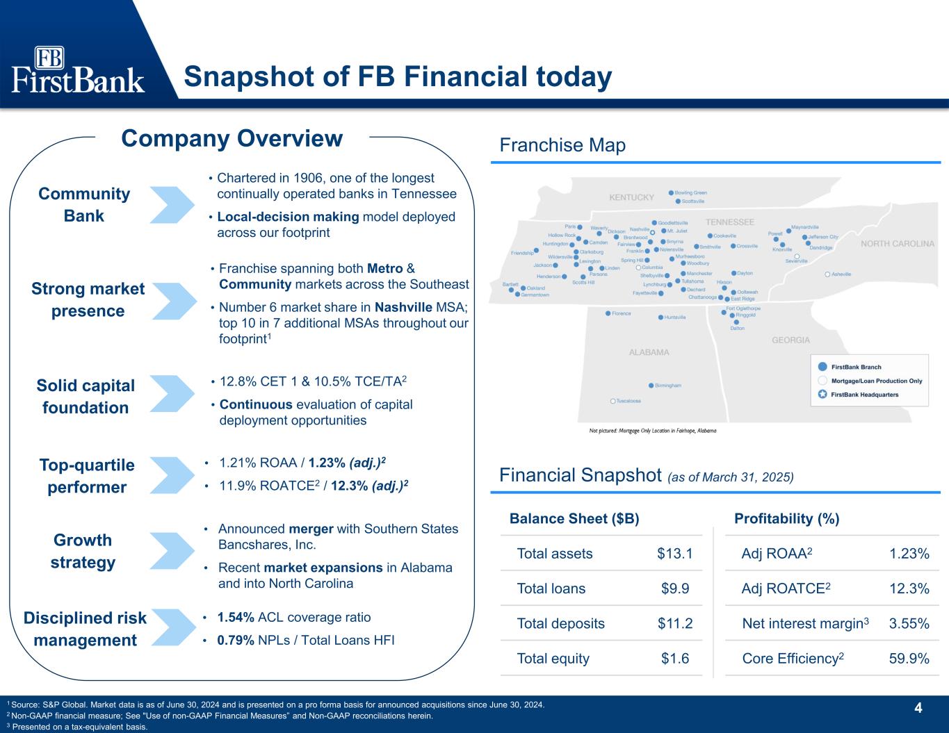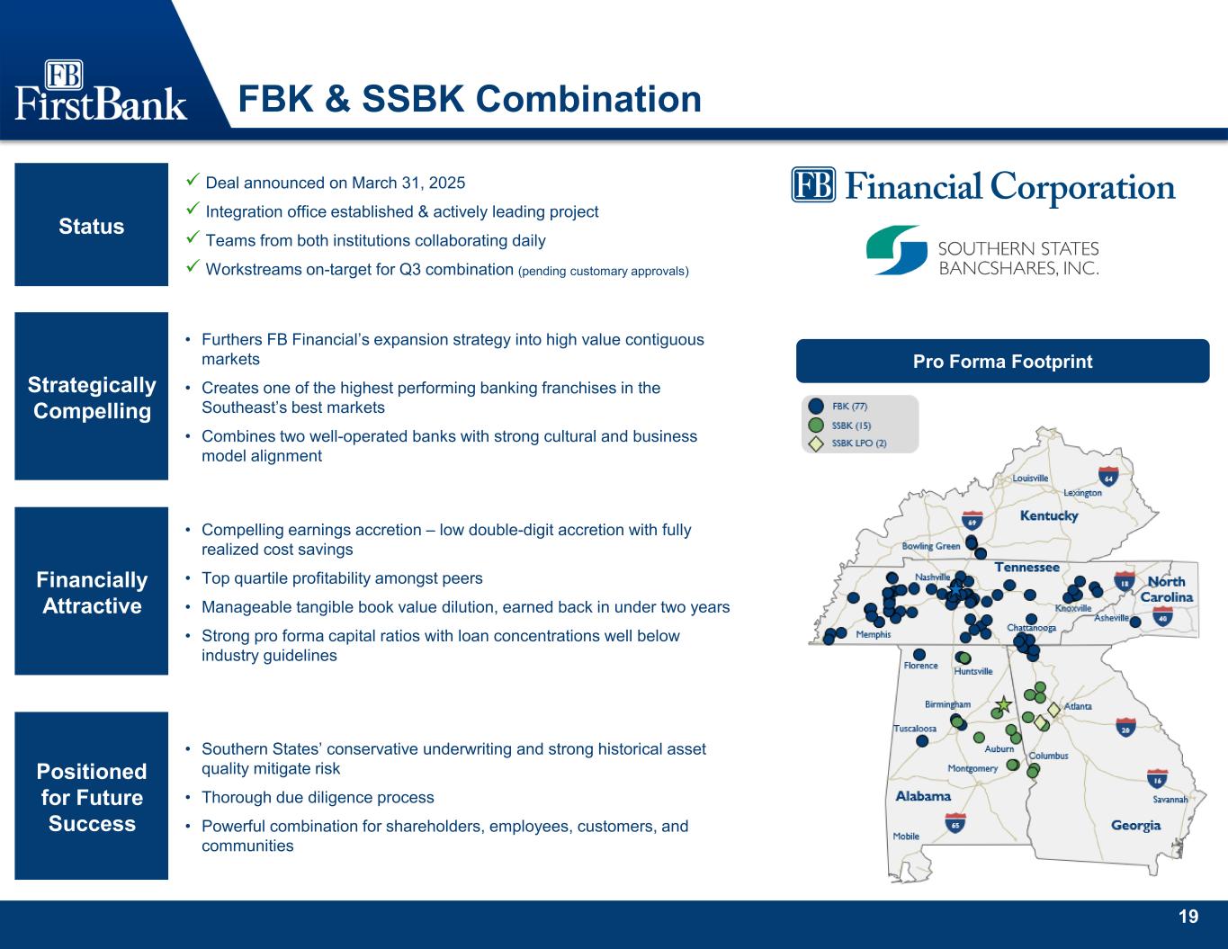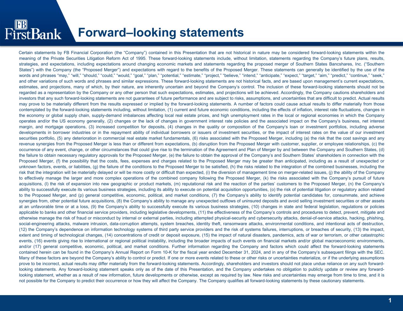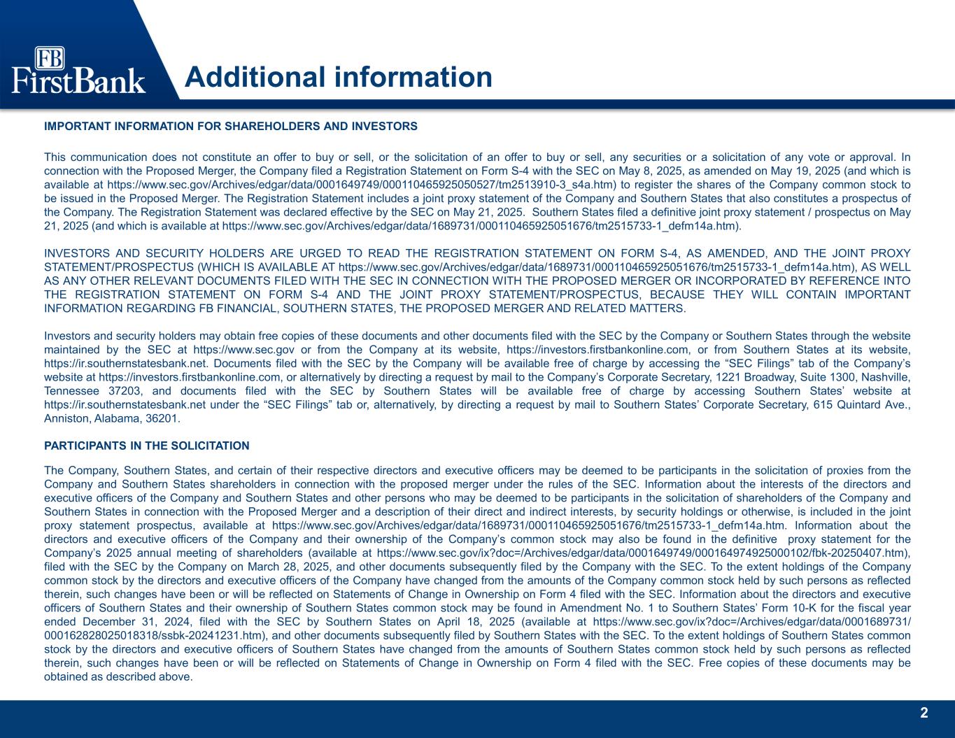 2 Additional information IMPORTANT INFORMATION FOR SHAREHOLDERS AND INVESTORS This communication does not constitute an offer to buy or sell, or the solicitation of an offer to buy or sell, any securities or a solicitation of any vote or approval. In connection with the Proposed Merger, the Company filed a Registration Statement on Form S-4 with the SEC on May 8, 2025, as amended on May 19, 2025 (and which is available at https://www.sec.gov/Archives/edgar/data/0001649749/000110465925050527/tm2513910-3_s4a.htm) to register the shares of the Company common stock to be issued in the Proposed Merger. The Registration Statement includes a joint proxy statement of the Company and Southern States that also constitutes a prospectus of the Company. The Registration Statement was declared effective by the SEC on May 21, 2025. Southern States filed a definitive joint proxy statement / prospectus on May 21, 2025 (and which is available at https://www.sec.gov/Archives/edgar/data/1689731/000110465925051676/tm2515733-1_defm14a.htm). INVESTORS AND SECURITY HOLDERS ARE URGED TO READ THE REGISTRATION STATEMENT ON FORM S-4, AS AMENDED, AND THE JOINT PROXY STATEMENT/PROSPECTUS (WHICH IS AVAILABLE AT https://www.sec.gov/Archives/edgar/data/1689731/000110465925051676/tm2515733-1_defm14a.htm), AS WELL AS ANY OTHER RELEVANT DOCUMENTS FILED WITH THE SEC IN CONNECTION WITH THE PROPOSED MERGER OR INCORPORATED BY REFERENCE INTO THE REGISTRATION STATEMENT ON FORM S-4 AND THE JOINT PROXY STATEMENT/PROSPECTUS, BECAUSE THEY WILL CONTAIN IMPORTANT INFORMATION REGARDING FB FINANCIAL, SOUTHERN STATES, THE PROPOSED MERGER AND RELATED MATTERS. Investors and security holders may obtain free copies of these documents and other documents filed with the SEC by the Company or Southern States through the website maintained by the SEC at https://www.sec.gov or from the Company at its website, https://investors.firstbankonline.com, or from Southern States at its website, https://ir.southernstatesbank.net. Documents filed with the SEC by the Company will be available free of charge by accessing the “SEC Filings” tab of the Company’s website at https://investors.firstbankonline.com, or alternatively by directing a request by mail to the Company’s Corporate Secretary, 1221 Broadway, Suite 1300, Nashville, Tennessee 37203, and documents filed with the SEC by Southern States will be available free of charge by accessing Southern States’ website at https://ir.southernstatesbank.net under the “SEC Filings” tab or, alternatively, by directing a request by mail to Southern States’ Corporate Secretary, 615 Quintard Ave., Anniston, Alabama, 36201. PARTICIPANTS IN THE SOLICITATION The Company, Southern States, and certain of their respective directors and executive officers may be deemed to be participants in the solicitation of proxies from the Company and Southern States shareholders in connection with the proposed merger under the rules of the SEC. Information about the interests of the directors and executive officers of the Company and Southern States and other persons who may be deemed to be participants in the solicitation of shareholders of the Company and Southern States in connection with the Proposed Merger and a description of their direct and indirect interests, by security holdings or otherwise, is included in the joint proxy statement prospectus, available at https://www.sec.gov/Archives/edgar/data/1689731/000110465925051676/tm2515733-1_defm14a.htm. Information about the directors and executive officers of the Company and their ownership of the Company’s common stock may also be found in the definitive proxy statement for the Company’s 2025 annual meeting of shareholders (available at https://www.sec.gov/ix?doc=/Archives/edgar/data/0001649749/000164974925000102/fbk-20250407.htm), filed with the SEC by the Company on March 28, 2025, and other documents subsequently filed by the Company with the SEC. To the extent holdings of the Company common stock by the directors and executive officers of the Company have changed from the amounts of the Company common stock held by such persons as reflected therein, such changes have been or will be reflected on Statements of Change in Ownership on Form 4 filed with the SEC. Information about the directors and executive officers of Southern States and their ownership of Southern States common stock may be found in Amendment No. 1 to Southern States’ Form 10-K for the fiscal year ended December 31, 2024, filed with the SEC by Southern States on April 18, 2025 (available at https://www.sec.gov/ix?doc=/Archives/edgar/data/0001689731/ 000162828025018318/ssbk-20241231.htm), and other documents subsequently filed by Southern States with the SEC. To the extent holdings of Southern States common stock by the directors and executive officers of Southern States have changed from the amounts of Southern States common stock held by such persons as reflected therein, such changes have been or will be reflected on Statements of Change in Ownership on Form 4 filed with the SEC. Free copies of these documents may be obtained as described above.