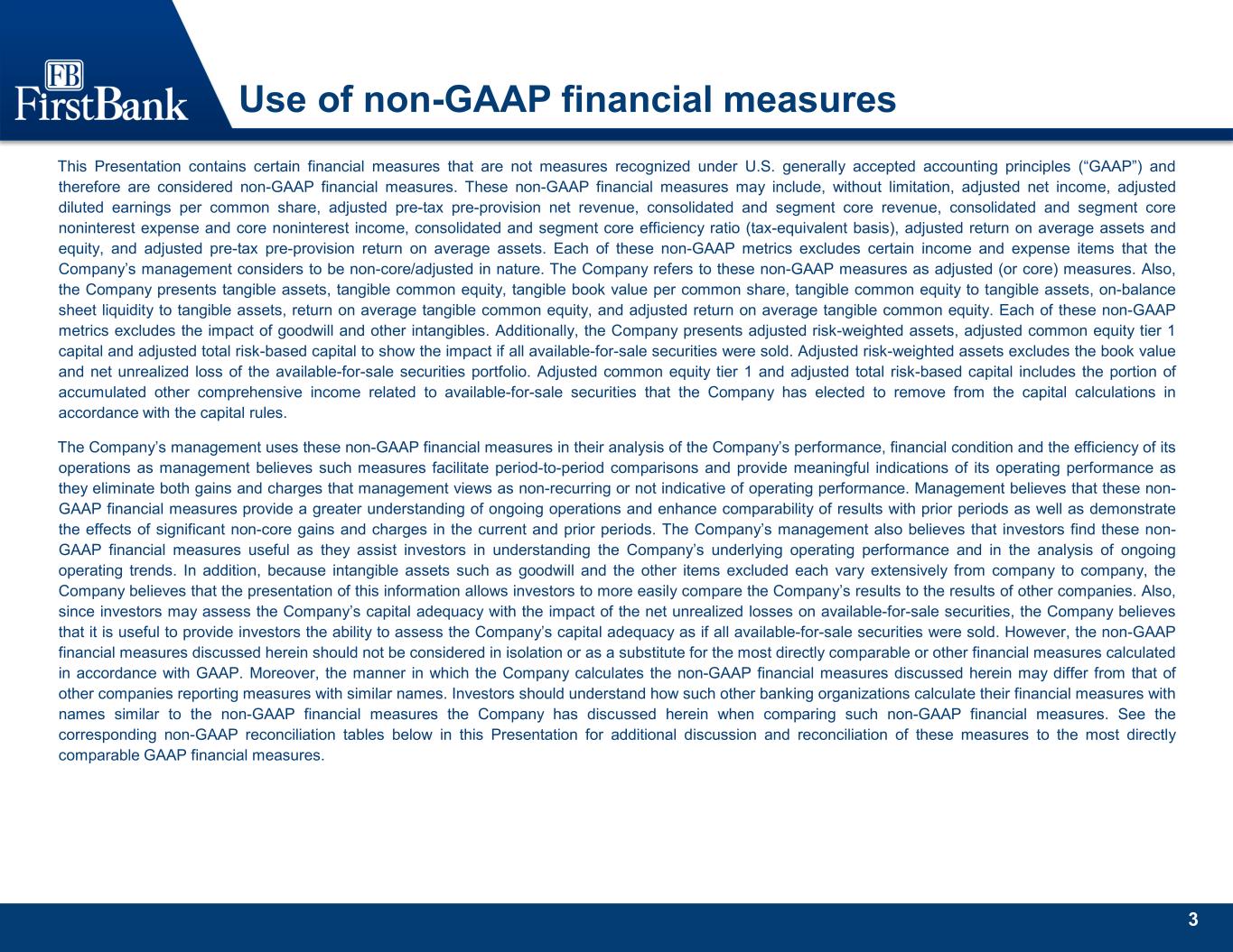 3 Use of non-GAAP financial measures This Presentation contains certain financial measures that are not measures recognized under U.S. generally accepted accounting principles (“GAAP”) and therefore are considered non-GAAP financial measures. These non-GAAP financial measures may include, without limitation, adjusted net income, adjusted diluted earnings per common share, adjusted pre-tax pre-provision net revenue, consolidated and segment core revenue, consolidated and segment core noninterest expense and core noninterest income, consolidated and segment core efficiency ratio (tax-equivalent basis), adjusted return on average assets and equity, and adjusted pre-tax pre-provision return on average assets. Each of these non-GAAP metrics excludes certain income and expense items that the Company’s management considers to be non-core/adjusted in nature. The Company refers to these non-GAAP measures as adjusted (or core) measures. Also, the Company presents tangible assets, tangible common equity, tangible book value per common share, tangible common equity to tangible assets, on-balance sheet liquidity to tangible assets, return on average tangible common equity, and adjusted return on average tangible common equity. Each of these non-GAAP metrics excludes the impact of goodwill and other intangibles. Additionally, the Company presents adjusted risk-weighted assets, adjusted common equity tier 1 capital and adjusted total risk-based capital to show the impact if all available-for-sale securities were sold. Adjusted risk-weighted assets excludes the book value and net unrealized loss of the available-for-sale securities portfolio. Adjusted common equity tier 1 and adjusted total risk-based capital includes the portion of accumulated other comprehensive income related to available-for-sale securities that the Company has elected to remove from the capital calculations in accordance with the capital rules. The Company’s management uses these non-GAAP financial measures in their analysis of the Company’s performance, financial condition and the efficiency of its operations as management believes such measures facilitate period-to-period comparisons and provide meaningful indications of its operating performance as they eliminate both gains and charges that management views as non-recurring or not indicative of operating performance. Management believes that these non- GAAP financial measures provide a greater understanding of ongoing operations and enhance comparability of results with prior periods as well as demonstrate the effects of significant non-core gains and charges in the current and prior periods. The Company’s management also believes that investors find these non- GAAP financial measures useful as they assist investors in understanding the Company’s underlying operating performance and in the analysis of ongoing operating trends. In addition, because intangible assets such as goodwill and the other items excluded each vary extensively from company to company, the Company believes that the presentation of this information allows investors to more easily compare the Company’s results to the results of other companies. Also, since investors may assess the Company’s capital adequacy with the impact of the net unrealized losses on available-for-sale securities, the Company believes that it is useful to provide investors the ability to assess the Company’s capital adequacy as if all available-for-sale securities were sold. However, the non-GAAP financial measures discussed herein should not be considered in isolation or as a substitute for the most directly comparable or other financial measures calculated in accordance with GAAP. Moreover, the manner in which the Company calculates the non-GAAP financial measures discussed herein may differ from that of other companies reporting measures with similar names. Investors should understand how such other banking organizations calculate their financial measures with names similar to the non-GAAP financial measures the Company has discussed herein when comparing such non-GAAP financial measures. See the corresponding non-GAAP reconciliation tables below in this Presentation for additional discussion and reconciliation of these measures to the most directly comparable GAAP financial measures.