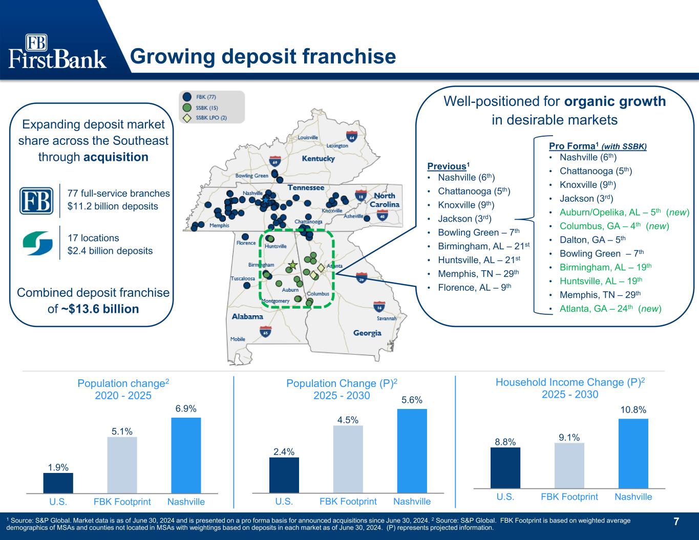 6 Recent corporate history 2021 Awarded “Top Workplaces” by the Tennessean; Named one of American Banker’s “Best Places to Work” 2020 Adj. ROAA1: 1.67% Adj. ROATCE1: 19.4% Year-End Assets: $11.2bn • Completed acquisition of FNB Financial Corporation; enter Bowling Green MSA ranked 7th in deposit market share • Converted online and mobile consumer banking platforms • Lift out of commercial team in Memphis • Completed acquisition of Franklin Financial Network; moved from 12th to 6th in the Nashville MSA in deposit market share • Raised $100 million of 4.50% subordinated debt 2022 Adj. ROAA1: 1.52% Adj. ROATCE1: 16.9% Year-End Assets: $12.6bn • Authorized $100 million share repurchase plan in February 2021 • Expanded banking division into Central Alabama in March 2021 with hiring of two experienced senior bankers in Birmingham 2023 Adj. ROAA1: 1.12% Adj. ROATCE1: 12.9% Year-End Assets: $12.8bn • Authorized $100 million share repurchase plan in March 2022 • Completed restructuring of Mortgage segment and closure of direct-to- consumer delivery channel • Acquired naming rights for Vanderbilt University football stadium 2024 Adj. ROAA1: 1.11% Adj. ROATCE1: 12.8% Year-End Assets: $12.6bn • Began implementation of the FirstBank Way as the foundation to position FirstBank as a premier banking franchise with elite financial performance now and in the future by standardizing sales and services under one operating model • Reduced core operating expense projections in FY 2023 by $20 million annualized​ • Sold $101 million of AFS debt securities and captured 4.27% yield improvement in FY 2023 • Reduced construction loans to bank Tier 1 capital plus ACL2 from 119% at 4Q22 to 93% as of 4Q23; increased Total RBC ratio from 13.1% at 4Q22 to 14.5% as of 4Q23 Adj. ROAA1: 1.25% Adj. ROATCE1: 12.9% Year-End Assets: $13.2bn • Market expansion into Asheville, NC and Tuscaloosa, AL • Completed 2 securities portfolio restructure transactions totaling $526M sold and reinvested at a weighted average yield improvement of ~3.3% • Continued focus on operating efficiency measures resulting in a core efficiency ratio* of 54.6% in 4Q24, down from 61.7% in 4Q23 • Well positioned with a strong balance sheet, evidenced by strong capital ratios – • 12.8% CET1 • 15.2% RBC Awarded “Top Workplaces” by the Tennessean 2025 Adj. ROAA1: 1.23% Adj. ROATCE1: 12.3% 1Q 2025 Assets: $13.1bn • Announced combination with Southern States Bancorp Inc. (“SSBK”) • About SSBK: • Headquarters: Anniston, AL • Publicly traded as SSBK on the NASDAQ • Geography: East Alabama & West Georgia • 15 branches & 2 LPOs • $2.9 million in Total Assets • Targeted deal closure and integration in 3Q25 Announced merger 1Non-GAAP financial measure; See “Use of non-GAAP Financial Measures” and Non-GAAP reconciliations herein. 2Concentration ratio for FirstBank. Note: Financial data presented on a consolidated basis.