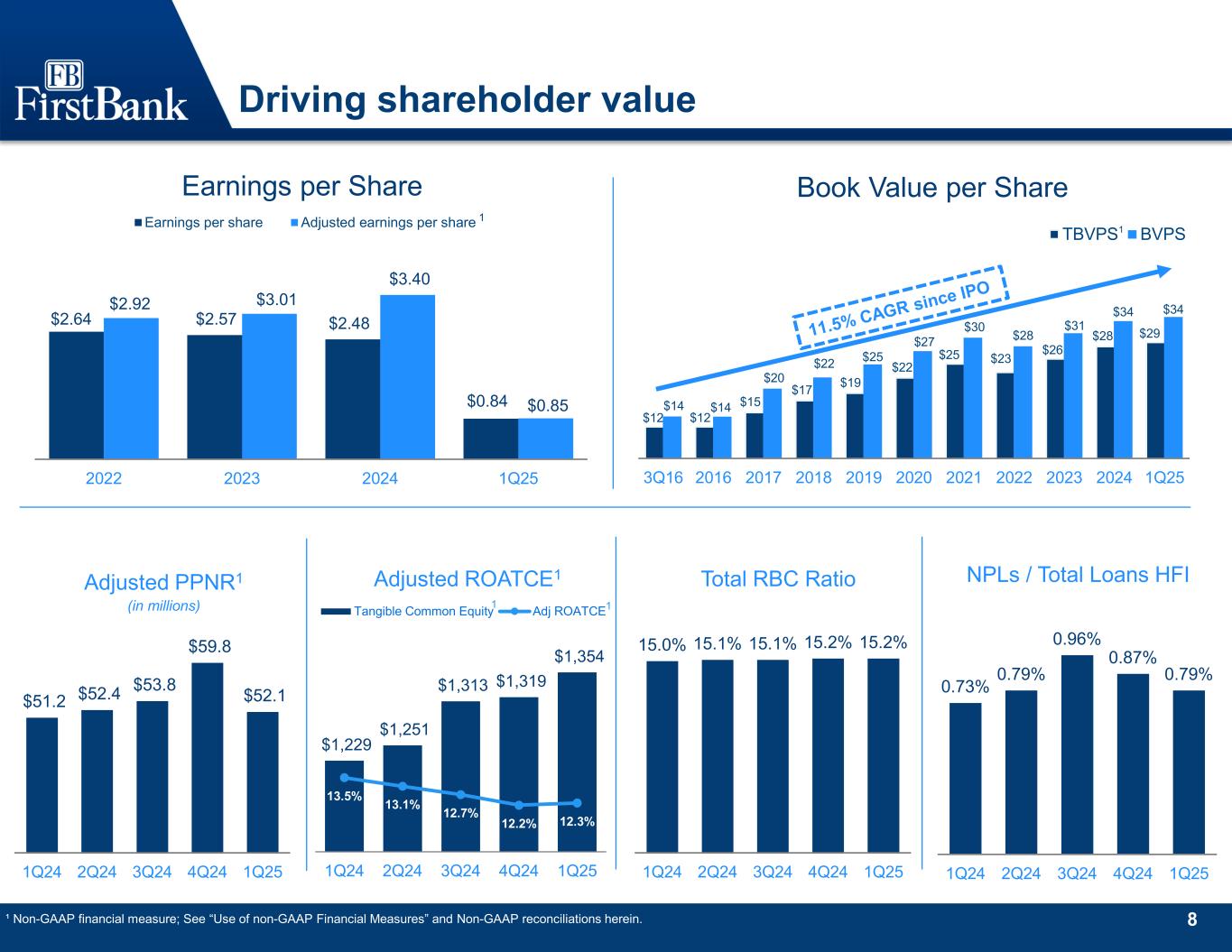 7 Growing deposit franchise 1 Source: S&P Global. Market data is as of June 30, 2024 and is presented on a pro forma basis for announced acquisitions since June 30, 2024. 2 Source: S&P Global. FBK Footprint is based on weighted average demographics of MSAs and counties not located in MSAs with weightings based on deposits in each market as of June 30, 2024. (P) represents projected information. Previous1 • Nashville (6th) • Chattanooga (5th) • Knoxville (9th) • Jackson (3rd) • Bowling Green – 7th • Birmingham, AL – 21st • Huntsville, AL – 21st • Memphis, TN – 29th • Florence, AL – 9th Pro Forma1 (with SSBK) • Nashville (6th) • Chattanooga (5th) • Knoxville (9th) • Jackson (3rd) • Auburn/Opelika, AL – 5th (new) • Columbus, GA – 4th (new) • Dalton, GA – 5th • Bowling Green – 7th • Birmingham, AL – 19th • Huntsville, AL – 19th • Memphis, TN – 29th • Atlanta, GA – 24th (new) 1.9% 5.1% 6.9% U.S. FBK Footprint Nashville Population change2 2020 - 2025 2.4% 4.5% 5.6% U.S. FBK Footprint Nashville Population Change (P)2 2025 - 2030 8.8% 9.1% 10.8% U.S. FBK Footprint Nashville Household Income Change (P)2 2025 - 2030 Well-positioned for organic growth in desirable markets 77 full-service branches $11.2 billion deposits 17 locations $2.4 billion deposits Expanding deposit market share across the Southeast through acquisition Combined deposit franchise of ~$13.6 billion
