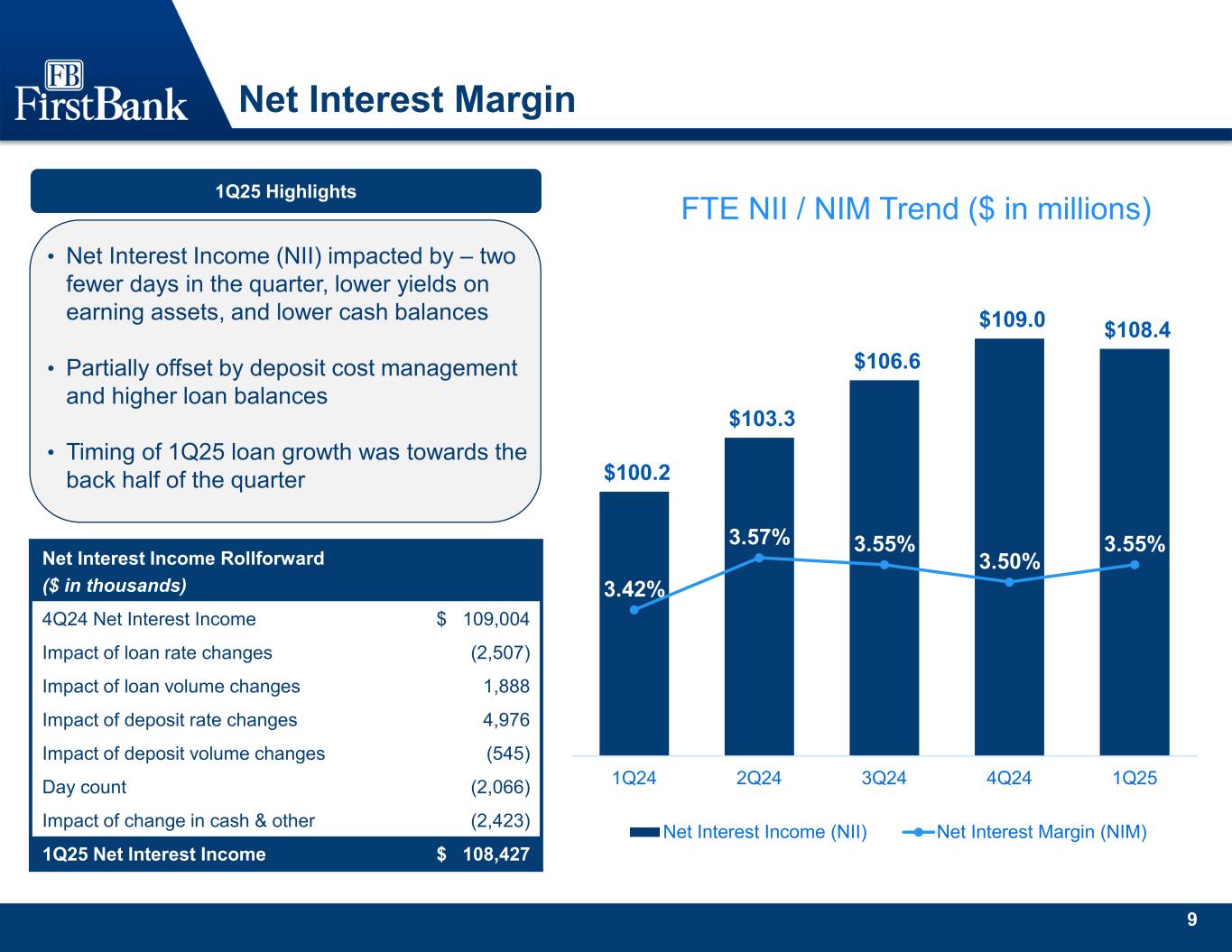 8 Driving shareholder value ¹ Non-GAAP financial measure; See “Use of non-GAAP Financial Measures” and Non-GAAP reconciliations herein. $2.64 $2.57 $2.48 $0.84 $2.92 $3.01 $3.40 $0.85 2022 2023 2024 1Q25 Earnings per share Adjusted earnings per share Earnings per Share $12 $12 $15 $17 $19 $22 $25 $23 $26 $28 $29 $14 $14 $20 $22 $25 $27 $30 $28 $31 $34 $34 3Q16 2016 2017 2018 2019 2020 2021 2022 2023 2024 1Q25 TBVPS BVPS 15.0% 15.1% 15.1% 15.2% 15.2% 1Q24 2Q24 3Q24 4Q24 1Q25 0.73% 0.79% 0.96% 0.87% 0.79% 1Q24 2Q24 3Q24 4Q24 1Q25 $51.2 $52.4 $53.8 $59.8 $52.1 1Q24 2Q24 3Q24 4Q24 1Q25 Book Value per Share Total RBC Ratio NPLs / Total Loans HFIAdjusted ROATCE1Adjusted PPNR1 (in millions) 1 1 $1,229 $1,251 $1,313 $1,319 $1,354 13.5% 13.1% 12.7% 12.2% 12.3% 1Q24 2Q24 3Q24 4Q24 1Q25 Tangible Common Equity Adj ROATCE11