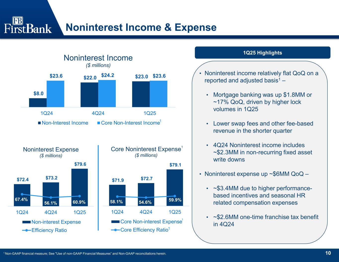 9 Net Interest Margin $100.2 $103.3 $106.6 $109.0 $108.4 3.42% 3.57% 3.55% 3.50% 3.55% 1Q24 2Q24 3Q24 4Q24 1Q25 FTE NII / NIM Trend ($ in millions) Net Interest Income (NII) Net Interest Margin (NIM) 1Q25 Highlights Net Interest Income Rollforward ($ in thousands) 4Q24 Net Interest Income $ 109,004 Impact of loan rate changes (2,507) Impact of loan volume changes 1,888 Impact of deposit rate changes 4,976 Impact of deposit volume changes (545) Day count (2,066) Impact of change in cash & other (2,423) 1Q25 Net Interest Income $ 108,427 • Net Interest Income (NII) impacted by – two fewer days in the quarter, lower yields on earning assets, and lower cash balances • Partially offset by deposit cost management and higher loan balances • Timing of 1Q25 loan growth was towards the back half of the quarter