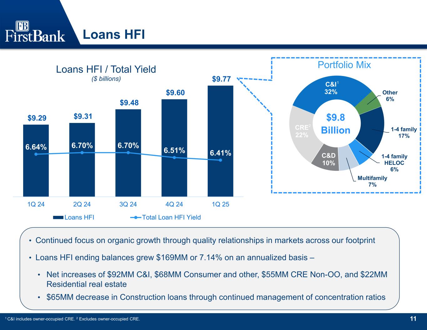10 Noninterest Income & Expense • Noninterest income relatively flat QoQ on a reported and adjusted basis1 – • Mortgage banking was up $1.8MM or ~17% QoQ, driven by higher lock volumes in 1Q25 • Lower swap fees and other fee-based revenue in the shorter quarter • 4Q24 Noninterest income includes ~$2.3MM in non-recurring fixed asset write downs • Noninterest expense up ~$6MM QoQ – • ~$3.4MM due to higher performance- based incentives and seasonal HR related compensation expenses • ~$2.6MM one-time franchise tax benefit in 4Q24 $72.4 $73.2 $79.6 67.4% 56.1% 60.9% 1Q24 4Q24 1Q25 Noninterest Expense ($ millions) Non-interest Expense Efficiency Ratio $71.9 $72.7 $79.1 58.1% 54.6% 59.9% 1Q24 4Q24 1Q25 Core Noninterest Expense ($ millions) Core Non-interest Expense Core Efficiency Ratio $8.0 $22.0 $23.0 $23.6 $24.2 $23.6 1Q24 4Q24 1Q25 Noninterest Income ($ millions) Non-Interest Income Core Non-Interest Income 1Q25 Highlights 1 1 Non-GAAP financial measure; See "Use of non-GAAP Financial Measures” and Non-GAAP reconciliations herein. 1 1 1
