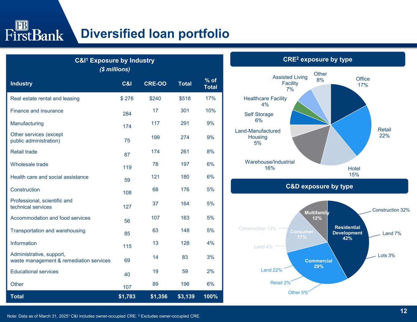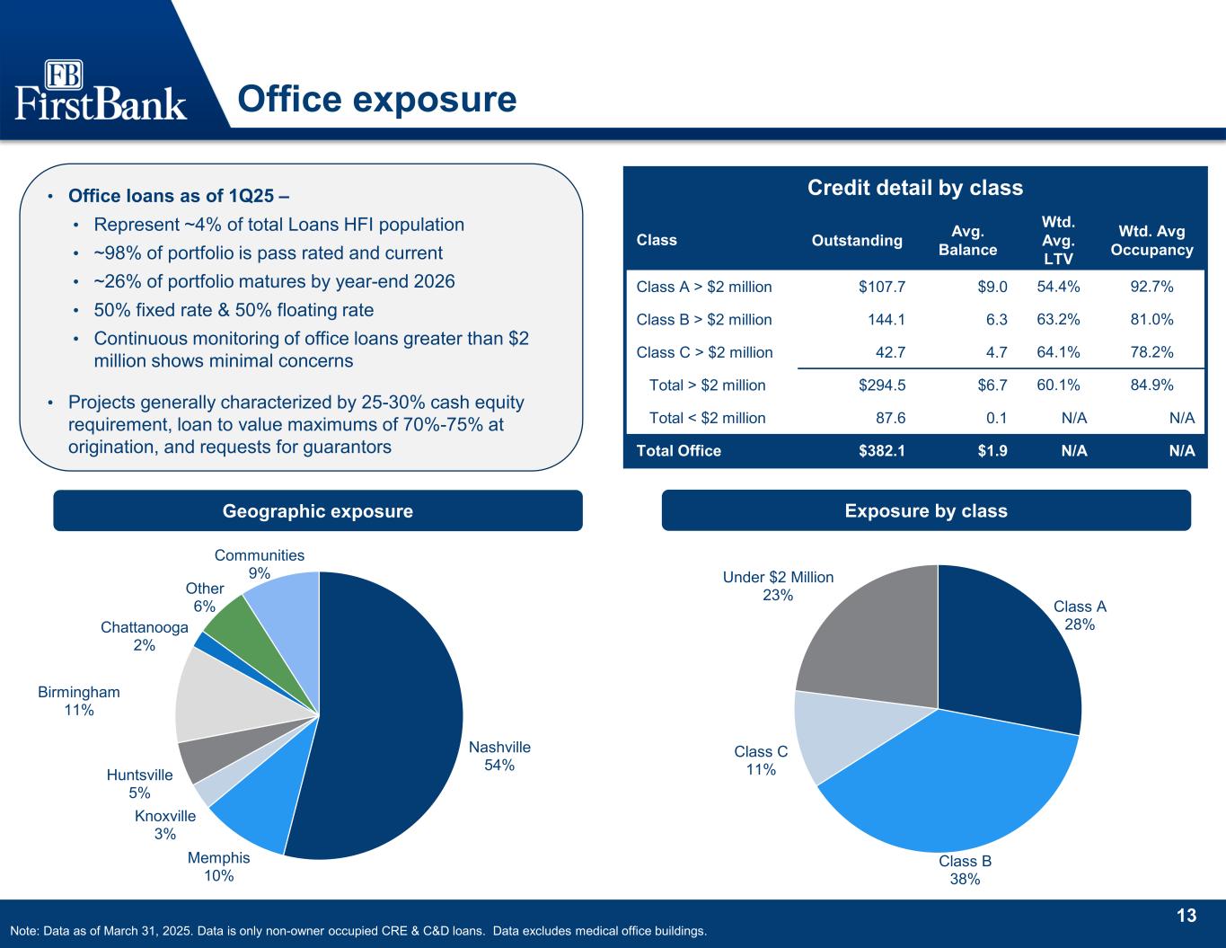 12 Residential Development 42% Commercial 29% Consumer 17% Multifamily 12% Construction 32% Land 7% Lots 3% Office 17% Retail 22% Hotel 15% Warehouse/Industrial 16% Land-Manufactured Housing 5% Self Storage 6% Healthcare Facility 4% Assisted Living Facility 7% Other 8% Diversified loan portfolio CRE2 exposure by type Note: Data as of March 31, 20251 C&I includes owner-occupied CRE. 2 Excludes owner-occupied CRE. C&D exposure by type C&I1 Exposure by Industry ($ millions) Industry C&I CRE-OO Total % of Total Real estate rental and leasing $ 278 $240 $518 17% Finance and insurance 284 17 301 10% Manufacturing 174 117 291 9% Other services (except public administration) 75 199 274 9% Retail trade 87 174 261 8% Wholesale trade 119 78 197 6% Health care and social assistance 59 121 180 6% Construction 108 68 176 5% Professional, scientific and technical services 127 37 164 5% Accommodation and food services 56 107 163 5% Transportation and warehousing 85 63 148 5% Information 115 13 128 4% Administrative, support, waste management & remediation services 69 14 83 3% Educational services 40 19 59 2% Other 107 89 196 6% Total $1,783 $1,356 $3,139 100% Land 22% Retail 2% Other 5% Construction 13% Land 4%