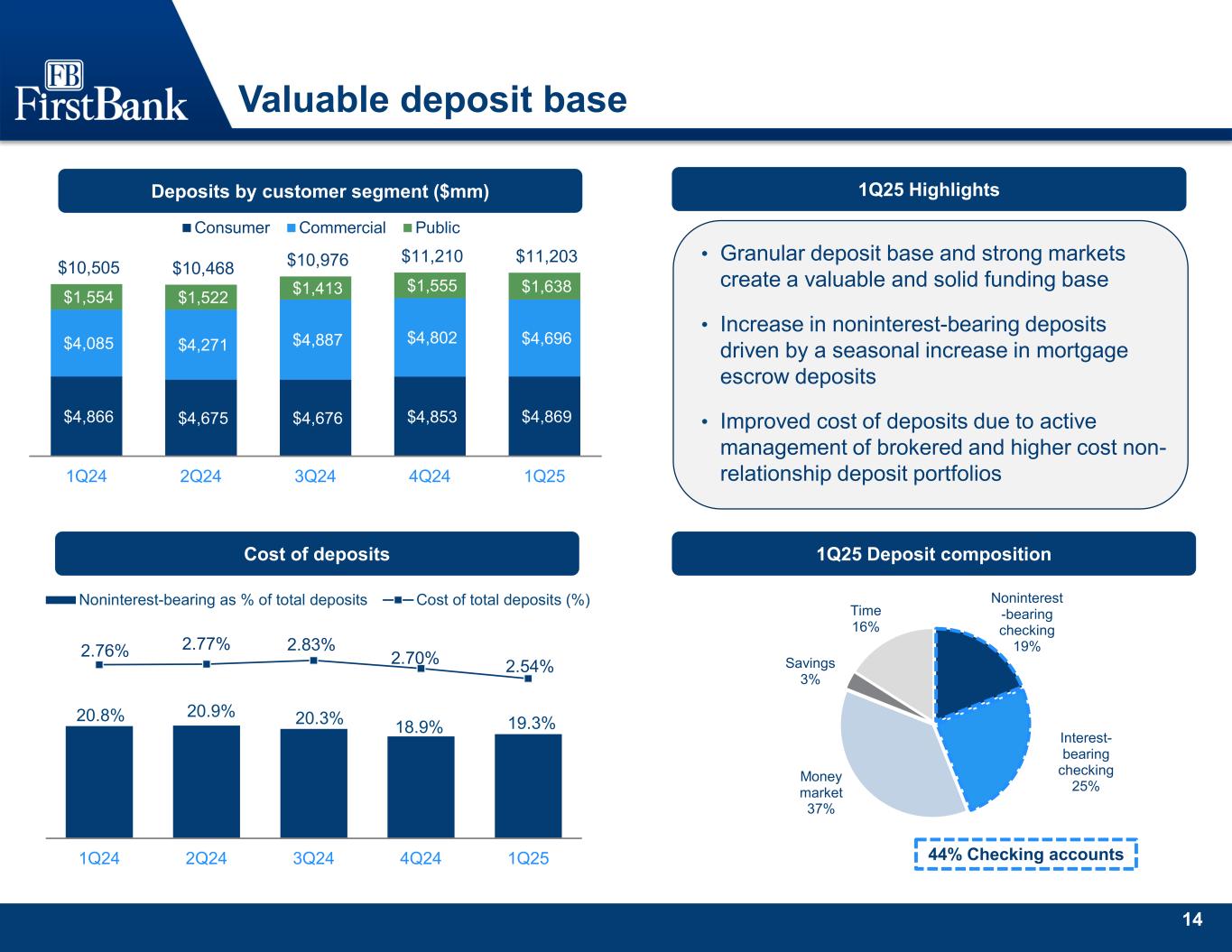13 Nashville 54% Memphis 10% Knoxville 3% Huntsville 5% Birmingham 11% Chattanooga 2% Other 6% Communities 9% Class A 28% Class B 38% Class C 11% Under $2 Million 23% Office exposure • Office loans as of 1Q25 – • Represent ~4% of total Loans HFI population • ~98% of portfolio is pass rated and current • ~26% of portfolio matures by year-end 2026 • 50% fixed rate & 50% floating rate • Continuous monitoring of office loans greater than $2 million shows minimal concerns • Projects generally characterized by 25-30% cash equity requirement, loan to value maximums of 70%-75% at origination, and requests for guarantors Geographic exposure Note: Data as of March 31, 2025. Data is only non-owner occupied CRE & C&D loans. Data excludes medical office buildings. Credit detail by class Class Outstanding Avg. Balance Wtd. Avg. LTV Wtd. Avg Occupancy Class A > $2 million $107.7 $9.0 54.4% 92.7% Class B > $2 million 144.1 6.3 63.2% 81.0% Class C > $2 million 42.7 4.7 64.1% 78.2% Total > $2 million $294.5 $6.7 60.1% 84.9% Total < $2 million 87.6 0.1 N/A N/A Total Office $382.1 $1.9 N/A N/A Exposure by class