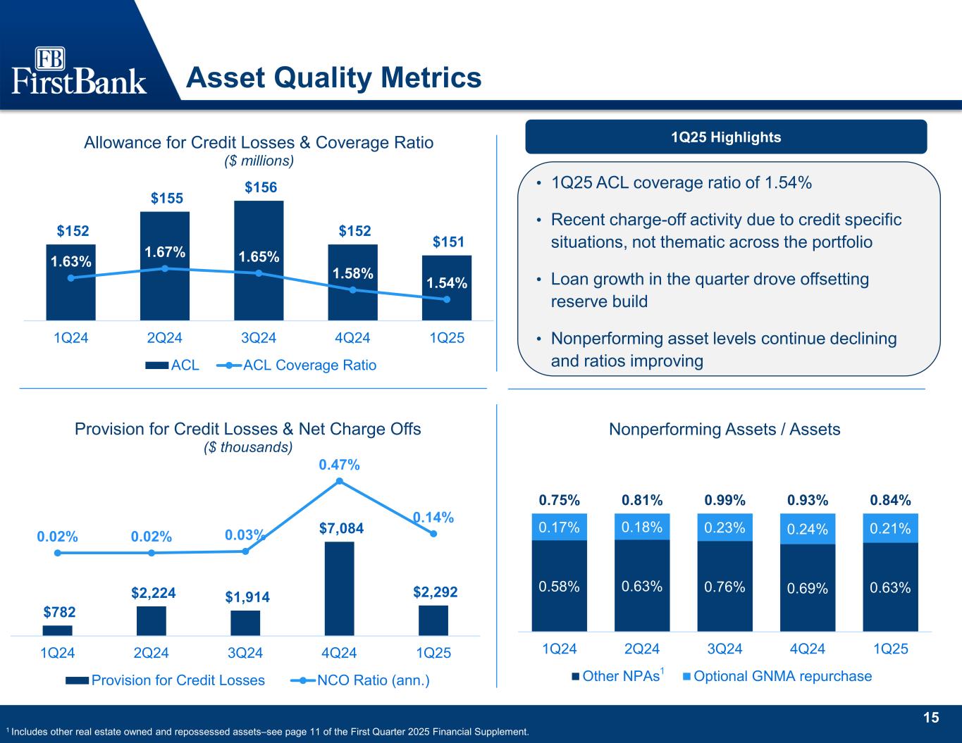 14 Valuable deposit base Cost of deposits 20.8% 20.9% 20.3% 18.9% 19.3% 2.76% 2.77% 2.83% 2.70% 2.54% 0.00% 0.50% 1.00% 1.50% 2.00% 2.50% 3.00% 0.0% 5.0% 10.0% 15.0% 20.0% 25.0% 30.0% 35.0% 1Q24 2Q24 3Q24 4Q24 1Q25 Noninterest-bearing as % of total deposits Cost of total deposits (%) $4,866 $4,675 $4,676 $4,853 $4,869 $4,085 $4,271 $4,887 $4,802 $4,696 $1,554 $1,522 $1,413 $1,555 $1,638 $10,505 $10,468 $10,976 $11,210 $11,203 1Q24 2Q24 3Q24 4Q24 1Q25 Consumer Commercial Public Deposits by customer segment ($mm) • Granular deposit base and strong markets create a valuable and solid funding base • Increase in noninterest-bearing deposits driven by a seasonal increase in mortgage escrow deposits • Improved cost of deposits due to active management of brokered and higher cost non- relationship deposit portfolios 1Q25 Highlights Noninterest -bearing checking 19% Interest- bearing checking 25% Money market 37% Savings 3% Time 16% 44% Checking accounts 1Q25 Deposit composition