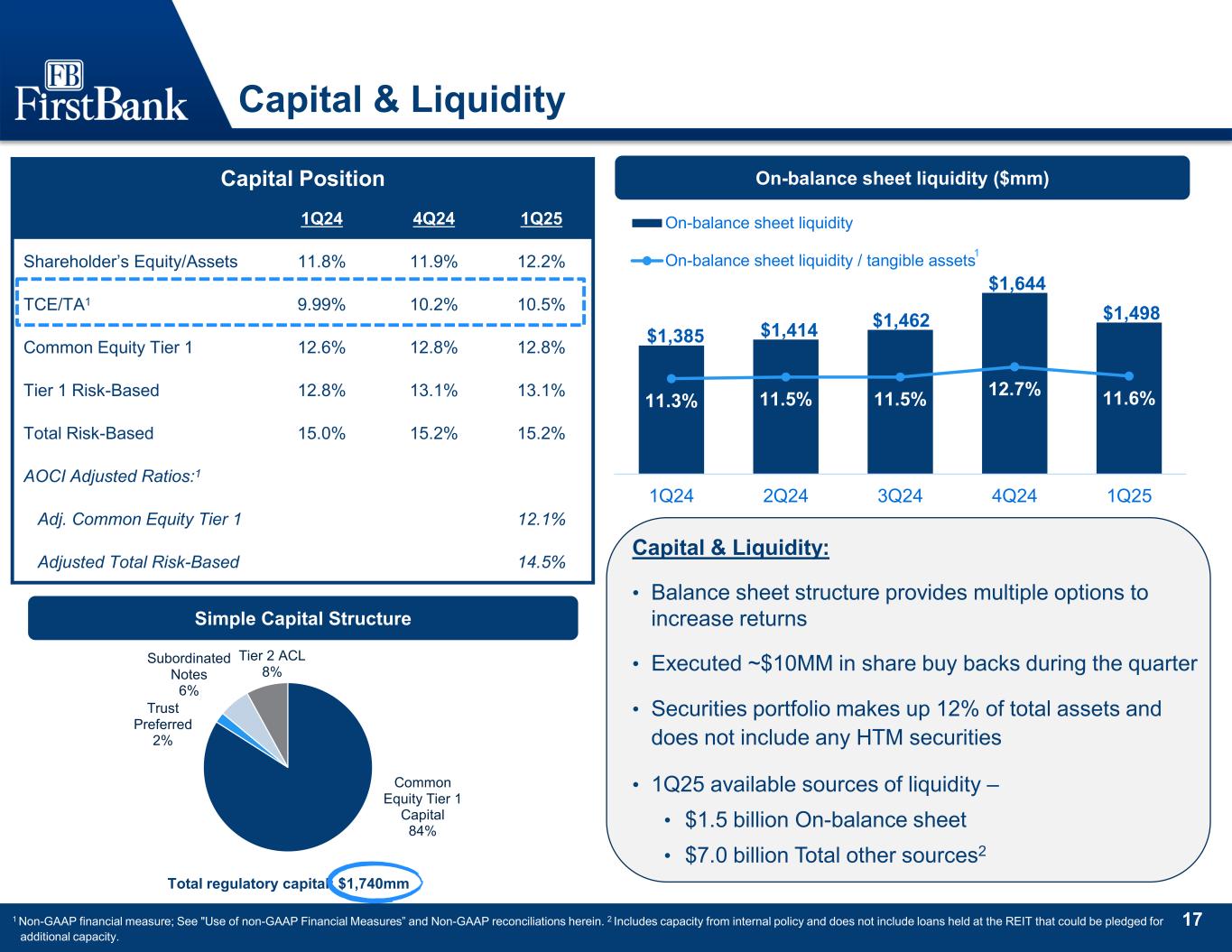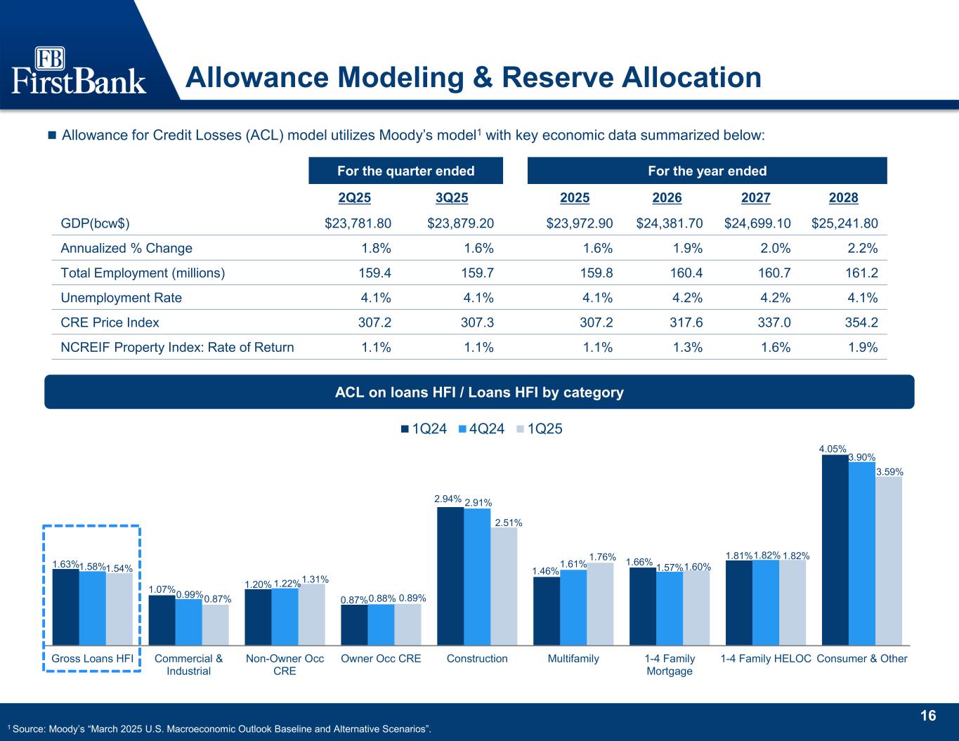 16 1.63% 1.07% 1.20% 0.87% 2.94% 1.46% 1.66% 1.81% 4.05% 1.58% 0.99% 1.22% 0.88% 2.91% 1.61% 1.57% 1.82% 3.90% 1.54% 0.87% 1.31% 0.89% 2.51% 1.76% 1.60% 1.82% 3.59% Gross Loans HFI Commercial & Industrial Non-Owner Occ CRE Owner Occ CRE Construction Multifamily 1-4 Family Mortgage 1-4 Family HELOC Consumer & Other 1Q24 4Q24 1Q25 Allowance Modeling & Reserve Allocation ACL on loans HFI / Loans HFI by category  Allowance for Credit Losses (ACL) model utilizes Moody’s model1 with key economic data summarized below: 1 Source: Moody’s “March 2025 U.S. Macroeconomic Outlook Baseline and Alternative Scenarios”. For the quarter ended For the year ended 2Q25 3Q25 2025 2026 2027 2028 GDP(bcw$) $23,781.80 $23,879.20 $23,972.90 $24,381.70 $24,699.10 $25,241.80 Annualized % Change 1.8% 1.6% 1.6% 1.9% 2.0% 2.2% Total Employment (millions) 159.4 159.7 159.8 160.4 160.7 161.2 Unemployment Rate 4.1% 4.1% 4.1% 4.2% 4.2% 4.1% CRE Price Index 307.2 307.3 307.2 317.6 337.0 354.2 NCREIF Property Index: Rate of Return 1.1% 1.1% 1.1% 1.3% 1.6% 1.9%