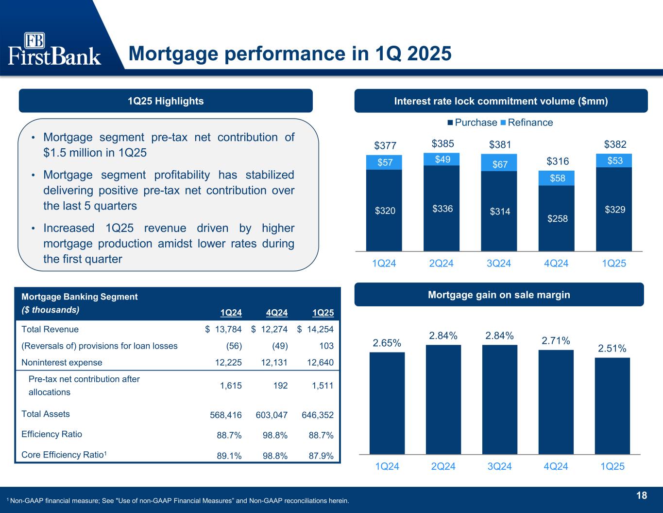 17 Capital & Liquidity Simple Capital Structure Common Equity Tier 1 Capital 84% Trust Preferred 2% Subordinated Notes 6% Tier 2 ACL 8% Total regulatory capital: $1,740mm 1 Non-GAAP financial measure; See "Use of non-GAAP Financial Measures” and Non-GAAP reconciliations herein. 2 Includes capacity from internal policy and does not include loans held at the REIT that could be pledged for additional capacity. Capital & Liquidity: • Balance sheet structure provides multiple options to increase returns • Executed ~$10MM in share buy backs during the quarter • Securities portfolio makes up 12% of total assets and does not include any HTM securities • 1Q25 available sources of liquidity – • $1.5 billion On-balance sheet • $7.0 billion Total other sources2 On-balance sheet liquidity ($mm) $1,385 $1,414 $1,462 $1,644 $1,498 11.3% 11.5% 11.5% 12.7% 11.6% 1Q24 2Q24 3Q24 4Q24 1Q25 On-balance sheet liquidity On-balance sheet liquidity / tangible assets Capital Position 1Q24 4Q24 1Q25 Shareholder’s Equity/Assets 11.8% 11.9% 12.2% TCE/TA1 9.99% 10.2% 10.5% Common Equity Tier 1 12.6% 12.8% 12.8% Tier 1 Risk-Based 12.8% 13.1% 13.1% Total Risk-Based 15.0% 15.2% 15.2% AOCI Adjusted Ratios:1 Adj. Common Equity Tier 1 12.1% Adjusted Total Risk-Based 14.5% 1