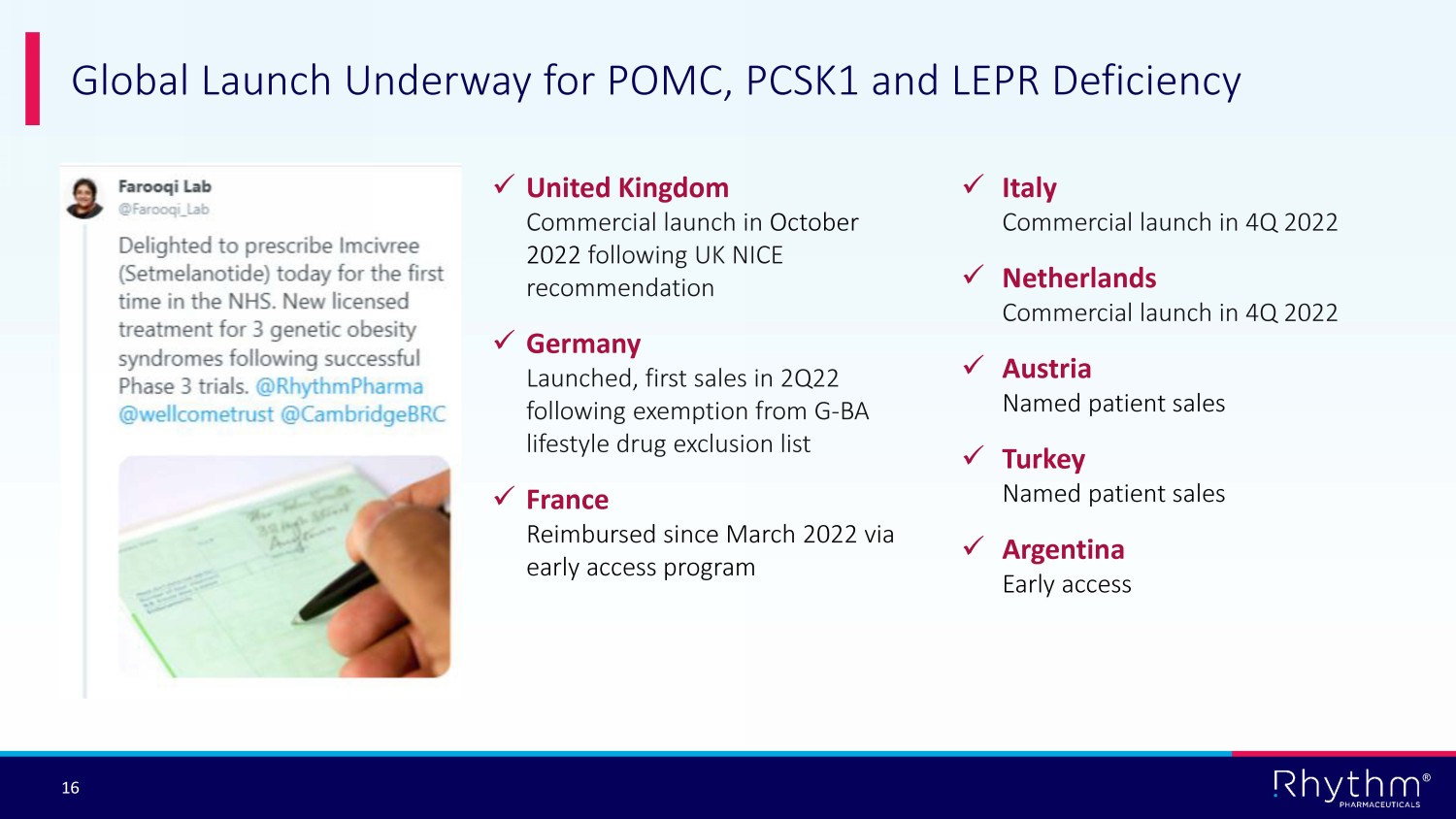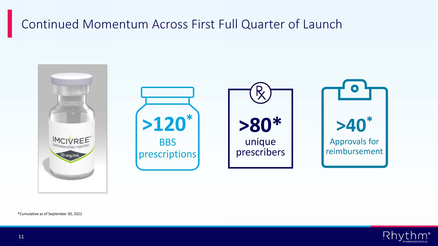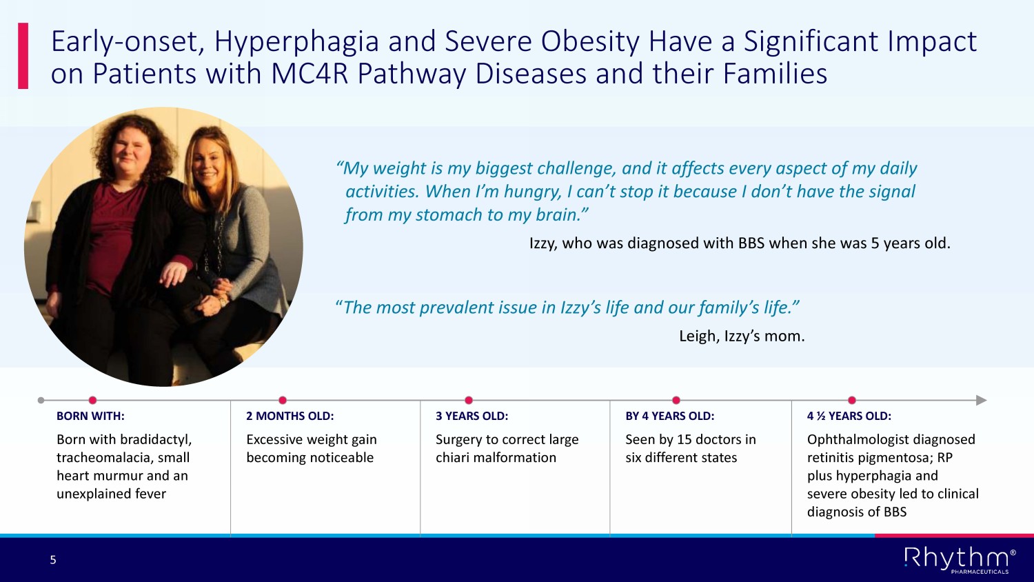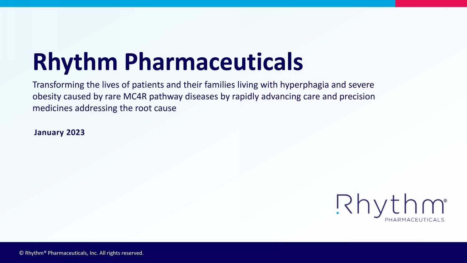 © Rhythm® Pharmaceuticals, Inc. All rights reserved. ® January 2023 Rhythm Pharmaceuticals Transforming the lives of patients and their families living with hyperphagia and severe obesity caused by rare MC4R pathway diseases by rapidly advancing care and precision medicines addressing the root cause