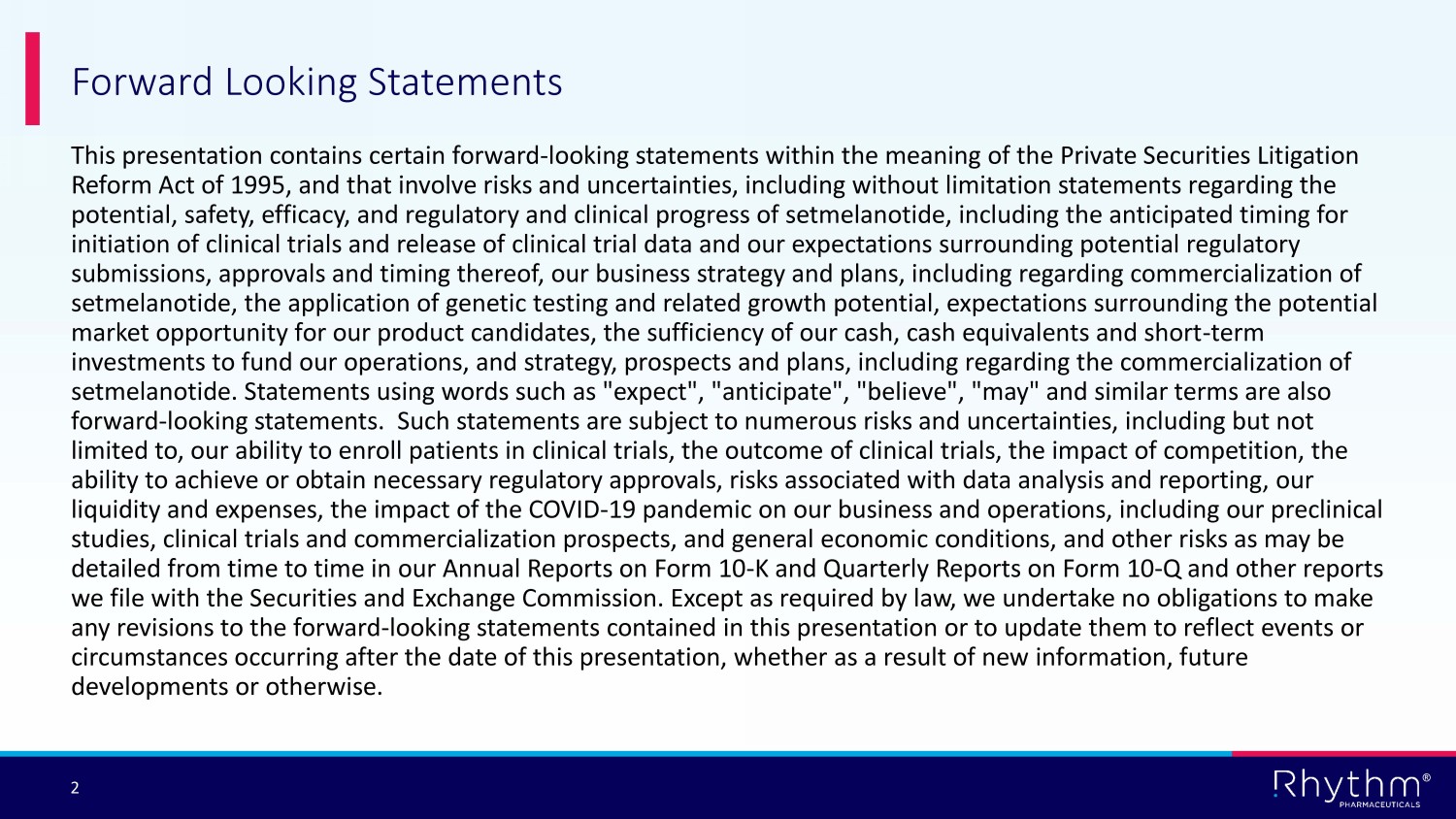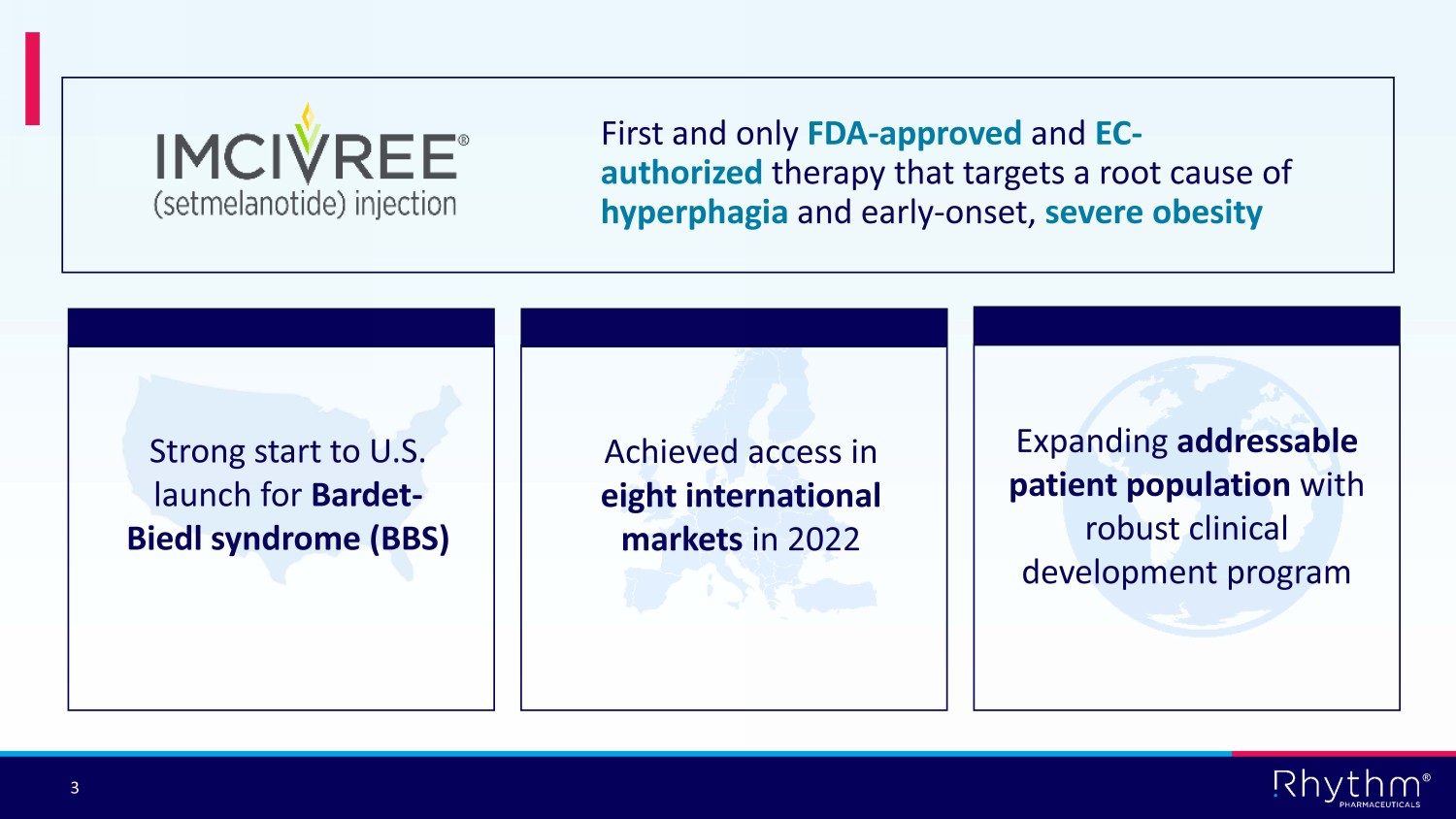 ® 2 This presentation contains certain forward - looking statements within the meaning of the Private Securities Litigation Reform Act of 1995, and that involve risks and uncertainties, including without limitation statements regarding the potential, safety, efficacy, and regulatory and clinical progress of setmelanotide, including the anticipated timing for initiation of clinical trials and release of clinical trial data and our expectations surrounding potential regulatory submissions, approvals and timing thereof, our business strategy and plans, including regarding commercialization of setmelanotide, the application of genetic testing and related growth potential, expectations surrounding the potential market opportunity for our product candidates, the sufficiency of our cash, cash equivalents and short - term investments to fund our operations, and strategy, prospects and plans, including regarding the commercialization of setmelanotide. Statements using words such as "expect", "anticipate", "believe", "may" and similar terms are also forward - looking statements. Such statements are subject to numerous risks and uncertainties, including but not limited to, our ability to enroll patients in clinical trials, the outcome of clinical trials, the impact of competition, the ability to achieve or obtain necessary regulatory approvals, risks associated with data analysis and reporting, our liquidity and expenses, the impact of the COVID - 19 pandemic on our business and operations, including our preclinical studies, clinical trials and commercialization prospects, and general economic conditions, and other risks as may be detailed from time to time in our Annual Reports on Form 10 - K and Quarterly Reports on Form 10 - Q and other reports we file with the Securities and Exchange Commission. Except as required by law, we undertake no obligations to make any revisions to the forward - looking statements contained in this presentation or to update them to reflect events or circumstances occurring after the date of this presentation, whether as a result of new information, future developments or otherwise. Forward Looking Statements