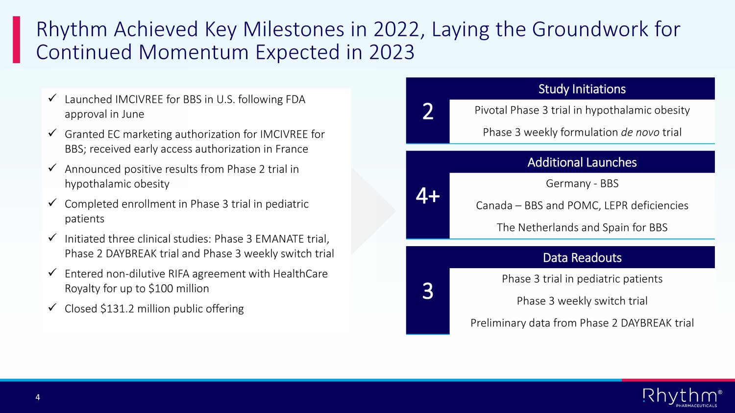 ® 3 First and only FDA - approved and EC - authorized therapy that targets a root cause of hyperphagia and early - onset, severe obesity Strong start to U.S. launch for Bardet - Biedl syndrome (BBS) Expanding addressable patient population with robust clinical development program Achieved access in eight international markets in 2022