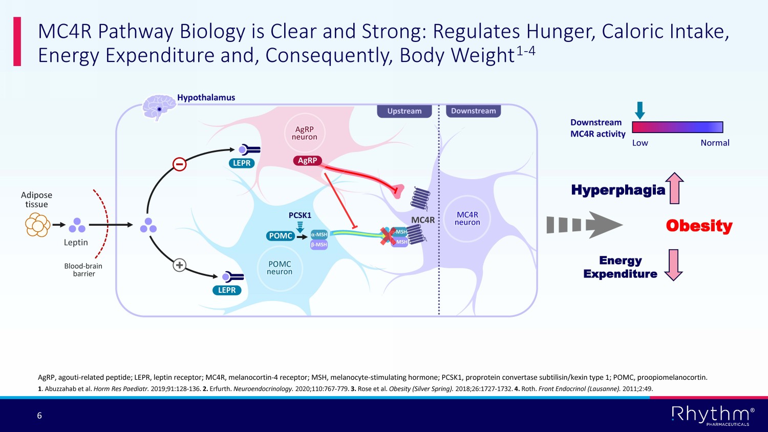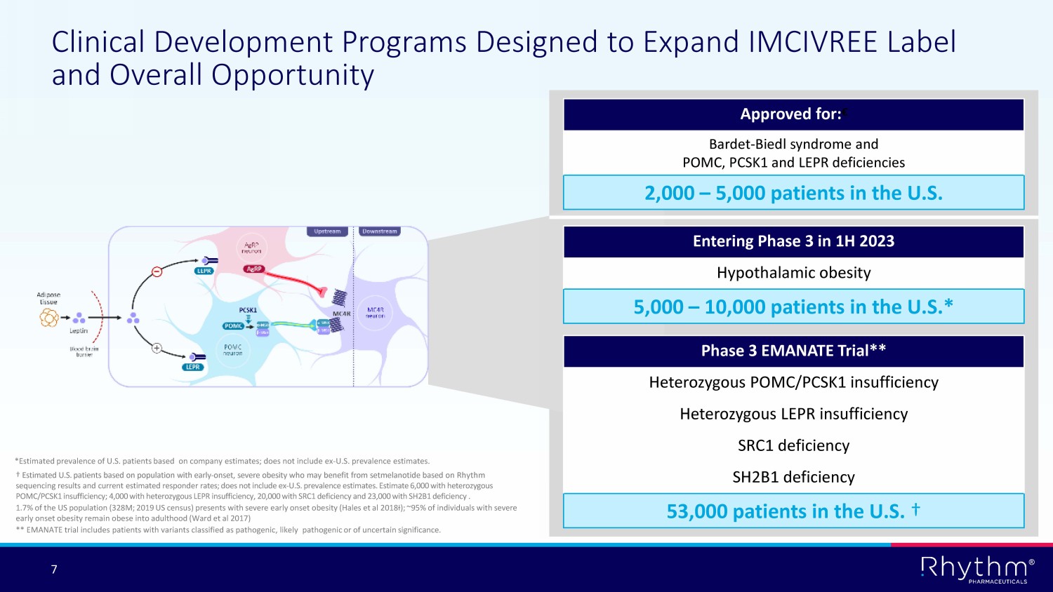 ® 6 Adipose tissue Leptin Blood - brain barrier MC4R neuron POMC neuron AgRP neuron AgRP LEPR Upstream Downstream Hypothalamus PCSK1 POMC LEPR MC4R Downstream MC4R activity Low Normal α - MSH β - MSH α - MSH β - MSH MC4R Pathway Biology is Clear and Strong: Regulates Hunger, Caloric Intake, Energy Expenditure and, Consequently, Body Weight 1 - 4 AgRP, agouti - related peptide; LEPR, leptin receptor; MC4R, melanocortin - 4 receptor; MSH, melanocyte - stimulating hormone; PCSK1, proprotein convertase subtilisin/kexin type 1; POMC, proopiomelanocortin. 1 . Abuzzahab et al. Horm Res Paediatr. 2019;91:128 - 136. 2. Erfurth. Neuroendocrinology. 2020;110:767 - 779. 3. Rose et al. Obesity (Silver Spring). 2018;26:1727 - 1732. 4. Roth. Front Endocrinol (Lausanne). 2011;2:49. Hyperphagia Energy Expenditure Obesity