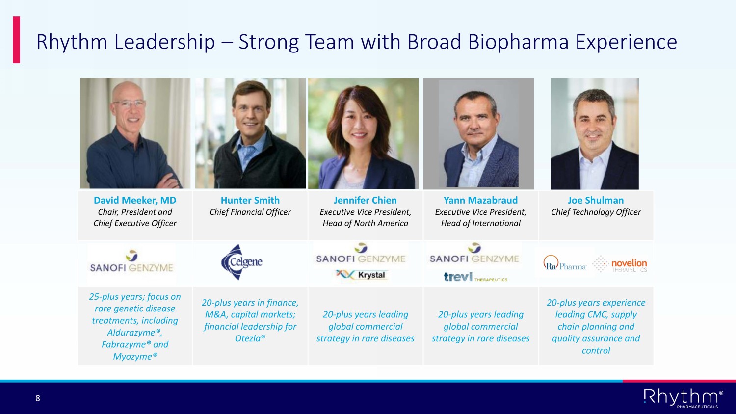 ® 8 David Meeker, MD Chair, President and Chief Executive Officer Hunter Smith Chief Financial Officer Jennifer Chien Executive Vice President, Head of North America Yann Mazabraud Executive Vice President, Head of International Joe Shulman Chief Technology Officer 25 - plus years; focus on rare genetic disease treatments, including Aldurazyme®, Fabrazyme® and Myozyme ® 20 - plus years in finance, M&A, capital markets; financial leadership for Otezla ® 20 - plus years leading global commercial strategy in rare diseases 20 - plus years leading global commercial strategy in rare diseases 20 - plus years experience leading CMC, supply chain planning and quality assurance and control Rhythm Leadership – Strong Team with Broad Biopharma Experience